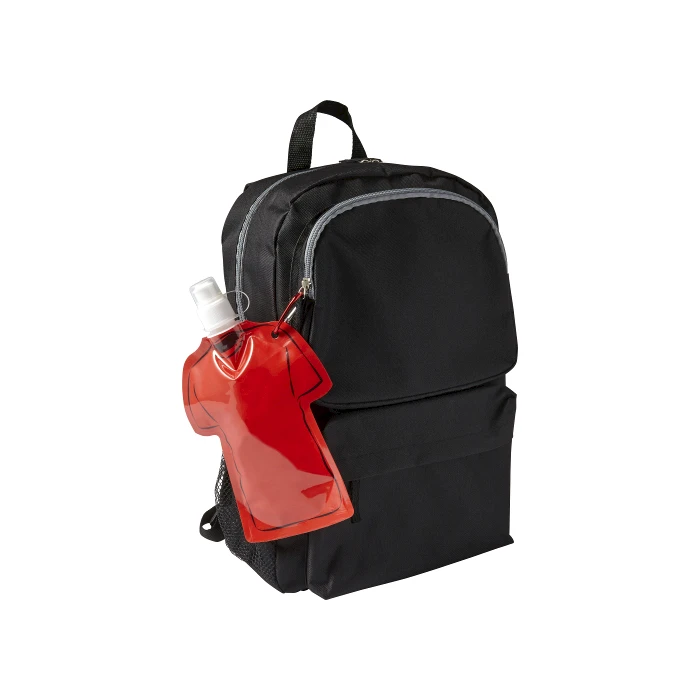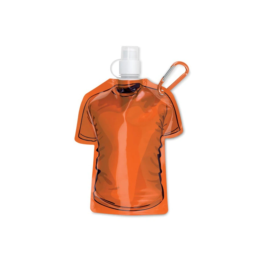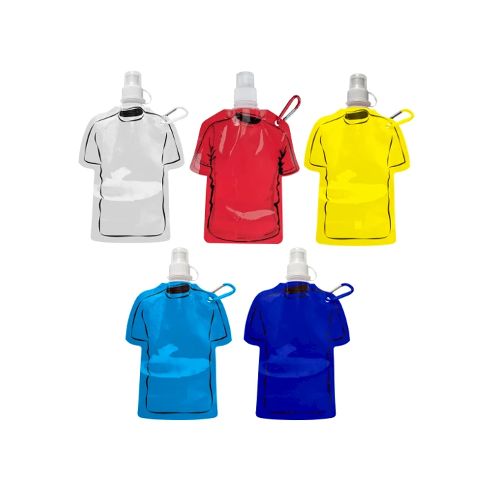 Kokoontaittuva juomapullo T-paita. T-paidan muotoinen vuotamaton vesipullo menee pieneen tilaan ja on helppo kuljettaa mukana. Juomapullossa pikakoukku. Värit: punainen, oranssi, valkoinen, musta, keltainen, sininen, v. sininen, harmaa, vihreä