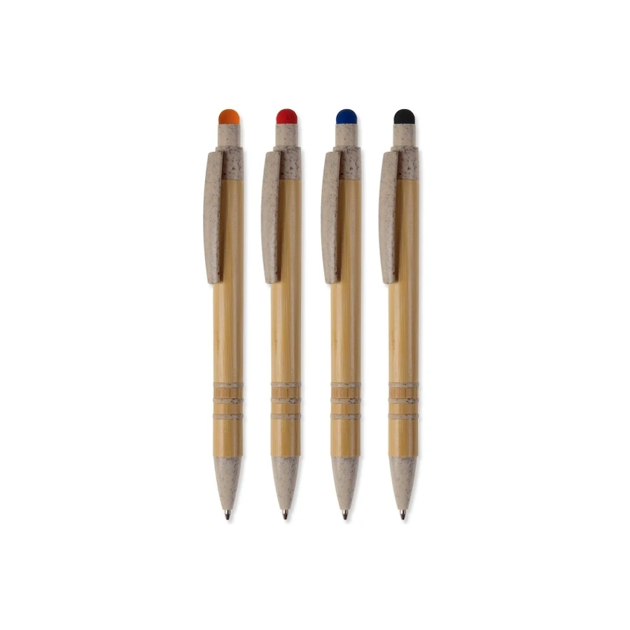 Kosketusnäyttökynä Bambu Vehnänolki. Bambu -kosketusnäyttökynä jonka muoviosat on valmistettu vehnänoljesta. Kynän päässä värillinen kosketusnäyttöpää. Sininen jumbo-kirjoitus mustetäyttö.