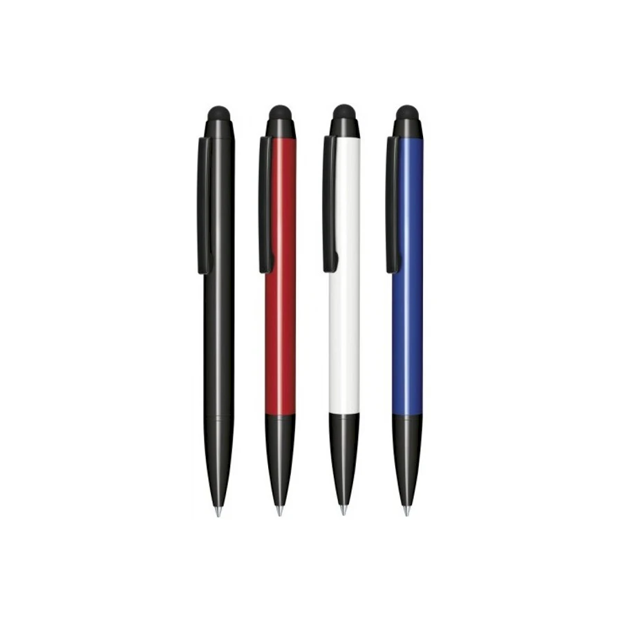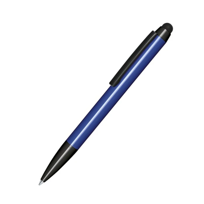 Kosketusnäyttökynä metallisella rungolla ja mustilla metallisilla yksityiskohdilla. Kuulakärkikynässä kierremekanismi ja kosketusnäyttöpää. Metalli runko ja mustat metalli osat. Kynässä on laadukas senator® metalli säiliö G2. Sininen kirjoitusmuste.