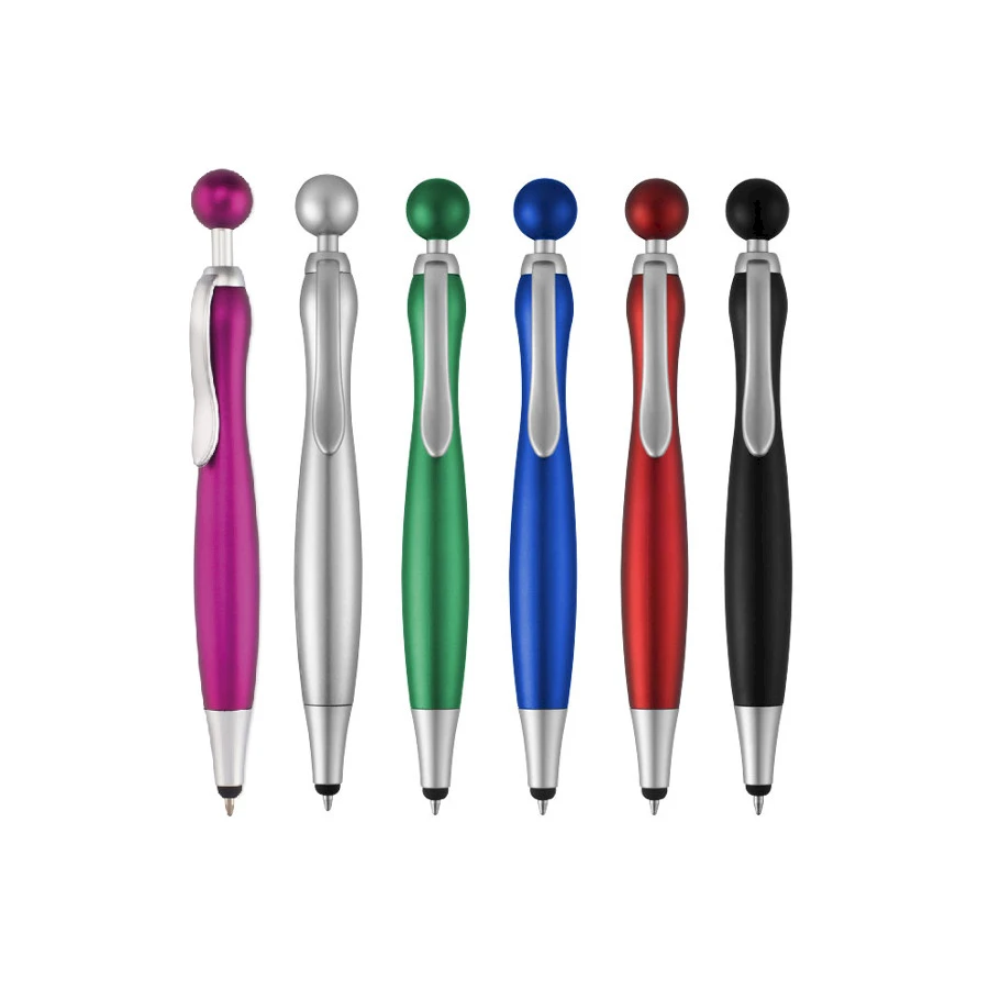 Kosketusnäyttökynä Top. Näyttävän mainoskynän kärjessä sekä kosketusnäyttöpää ja kuulakärki. Painomekanismi. ABS muovia. Koko: 14 cm x 1,4 cm. Saatavana useissa raikkaissa väreissä.