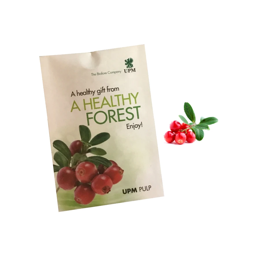 Kotimaiset kuivatut marjat painetussa mainospussissa. Pussin sisällä Suomalaista kuivattua mustikkaa tai puolukkaa. Marjat on pakattu ilmatiiviseen pussiin, jossa ne säilyvät herkullisina ja rapeina. Minimi tilausmäärä painettuna 100 kpl. Yrityksesi mainosviestillä painettu marjapussi on ekologinen kotimainen mainostuote. Pyydä tarjous.