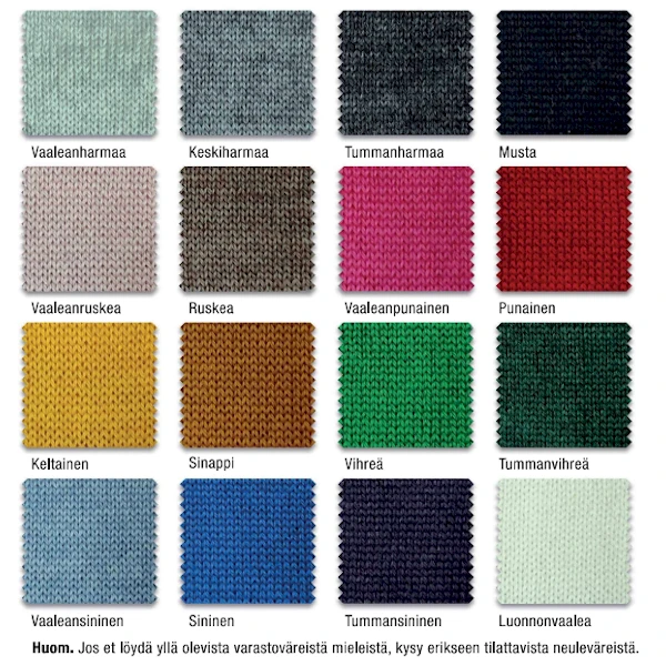 Värit: vaaleanharmaa, keskiharmaa, tummanharmaa, musta, vaaleanruskea, ruskea, punainen, keltainen, sinappi, vihreä, tummanvihreä, vaaleansininen, sininen, tummansininen, luonnonvaalea, rosa.