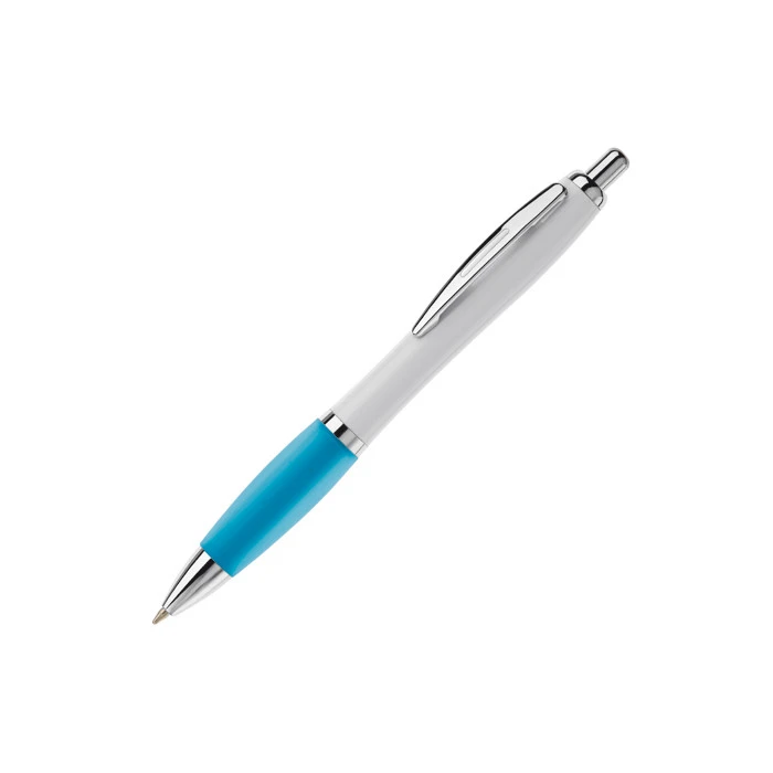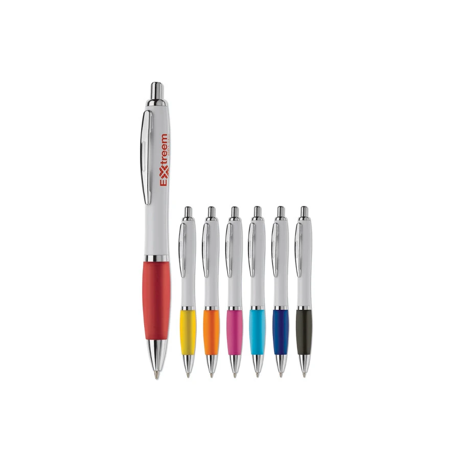 Kuulakynä, jossa metalliosat. Valkoinen runko, kuminen pidinosa ja pitkäkestoinen säiliö.