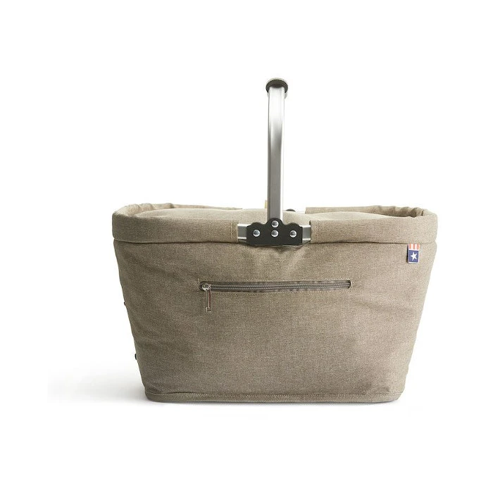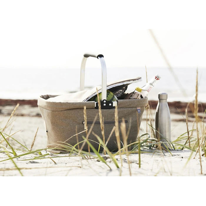 Klassinen pellavakankaiselta näyttävä kylmäkori, jossa on fiksuja toimintoja. Kannen voi rullata kokoon ja kiinnittää tarralla reunaan, joilloin kori pysyy avonaisena. Laukun voi myös taittaa kokoon silloin, kun sitä ei käytetä. Painatus voidaan tehdä molemmille puolille koria.