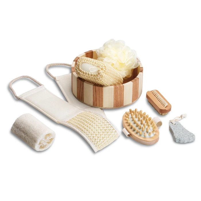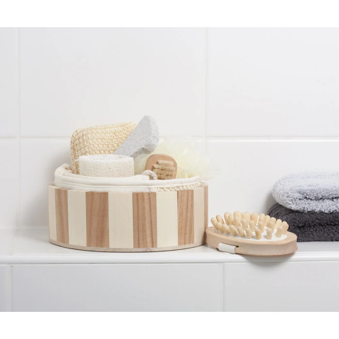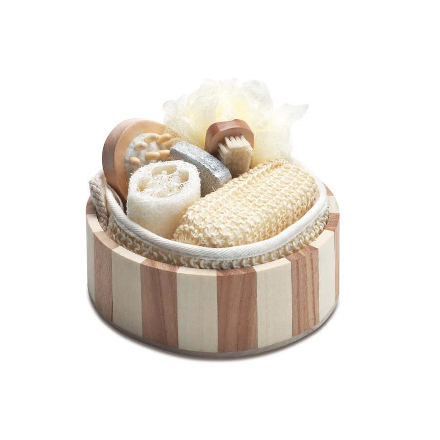 Tämä kylpysetti auttaa rentoutumaan arjen keskellä. Settiin kuuluu hierontaharja, selänpesin, hohkakivi, pesusieniä, pyöreä puinen säilytyslaatikko. Tarjoa itsellesi tai läheisellesi akkujen lataamiseen sopiva hemmotteluhetki kotikylpylässä.Koko 234 x 234 x 141 mm sis. puisen kotelon 667 g