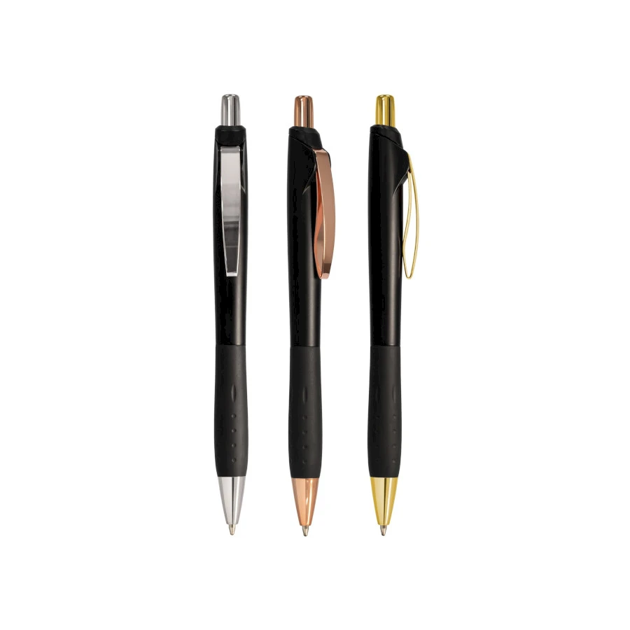 Todellinen katseenvangitsija! De Luxe kynässä mattamusta runko ja kiiltävät ruusukullan, hopean tai kullan sävyiset osat. Kynässä pitävä otealue. Näyttävä kynä mainostarkoituksiin.