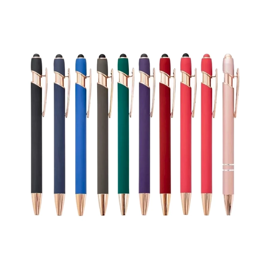 Tyylikäs kumipintainen kosketusnäyttökynä ruusukultaisilla yksityiskohdilla. Kumipintaisesta kynästä saat hyvän otteen ja sillä on miellyttävä kirjoittaa. Kynän painonapissa on kosketusnäyttöpää. Logomerkkaus kynään painamalla tai lasermerkkauksena. Pyydä tarjous.