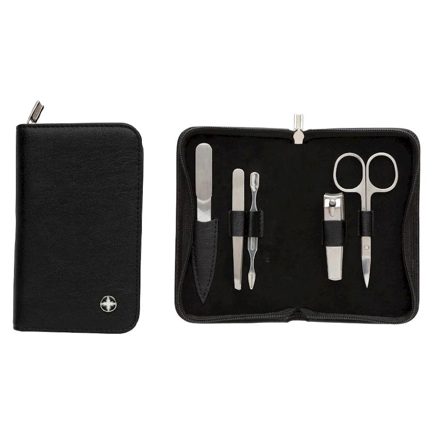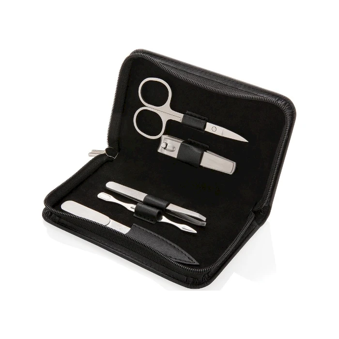 Kynsienhoitosetissä on viisi osaa ruostumattomasta teräksestä. 5-osainen manikyyrisetti sisältää kynsileikkurin, kynsiviilan, pinsetit, kynsisakset ja kynsinauhan työntäjän. Kaikki instrumentit on valmistettu mattaharjatusta ruostumattomasta teräksestä ja pakattu kauniiseen mustaan keinonahka PU-koteloon.