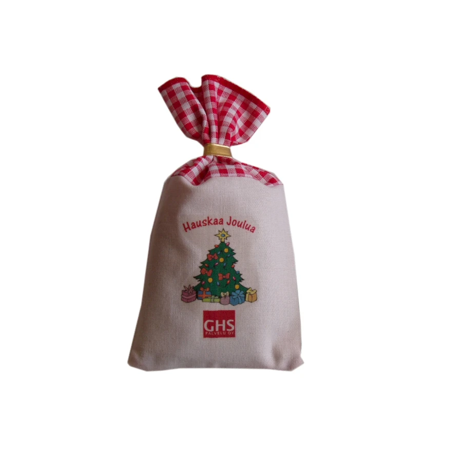 Kangaspussi, jossa sisällä Joulun perinteisiä makuja valintasi mukaan. Voit valita pussin sisälle glögimausteen, puuroriisin, kotikaljan, suklaan, manteli-rusina sekoituksen tai sinapin. Saatavilla useita eri kokoisia pusseja. Yrityksesi joulutervehdys voidaan painaa monivärisesti pussiin. Pyydä tarjous.