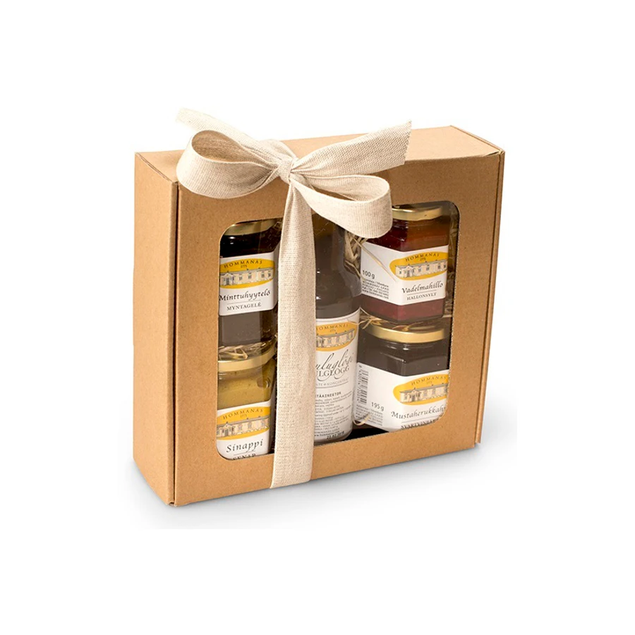Kotimaisessa Hommanäsin joulupaketissa on sinappi, jouluglögi sekä hyytelölajitelma, jossa mustaherukkahyytelö ja vadelmahilloa. Anna maukas lahjasetti lahjaksi jossa on perinteisiä kotimaisia makuja. Hommanäsin marjaisat mehut, hyytelöt ja hillot on valmistettu Suomessa. Marjaherkut eivät sisällä lisä- ja säilöntäaineita. Halutessasi saat pakettiin toivomasi herkut yhdistettynä muiden tuotteidemme kanssa. Pyydä tarjous omasta tuoteyhdistelmästä.