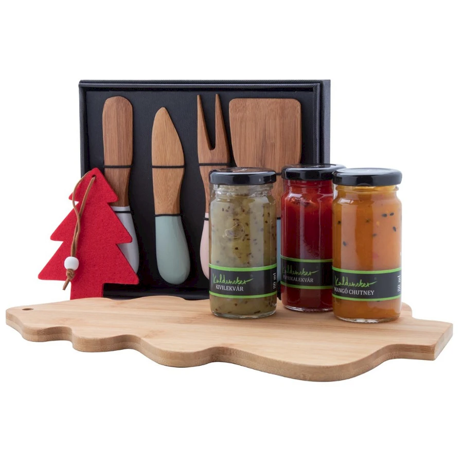 Jouluinen lahjasetti sisältää kuusen muotoisen leikkuulaudan, huopaisen kuusenkoristeen,juustoveitsisetin jossa 4-osaa sekä maukkaita hilloja joulupöytään. Pakattu lahjapakkaukseen.