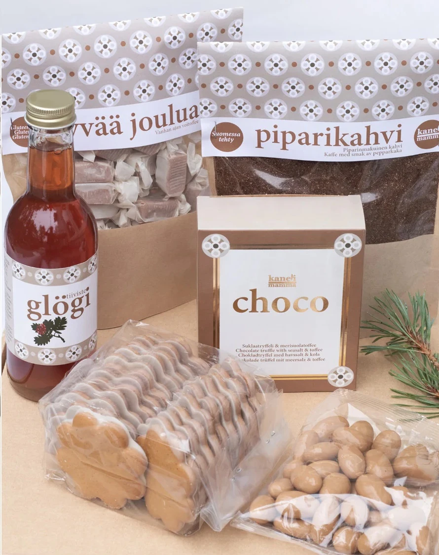 Lahjasetti Joulujuhlaherkku. Joulu on juhlan aikaa! Ruskeaan ekolaatikkoon on pakattu Kanelimamman palmuöljyttömiä ja suussa sulavia herkkuja. Paljon kotimaisia herkkuja kuten pipareita ja glögiä. Upea lahja jouluna vaikkapa yrityksen henkilökunnalle tai asiakkaille.
