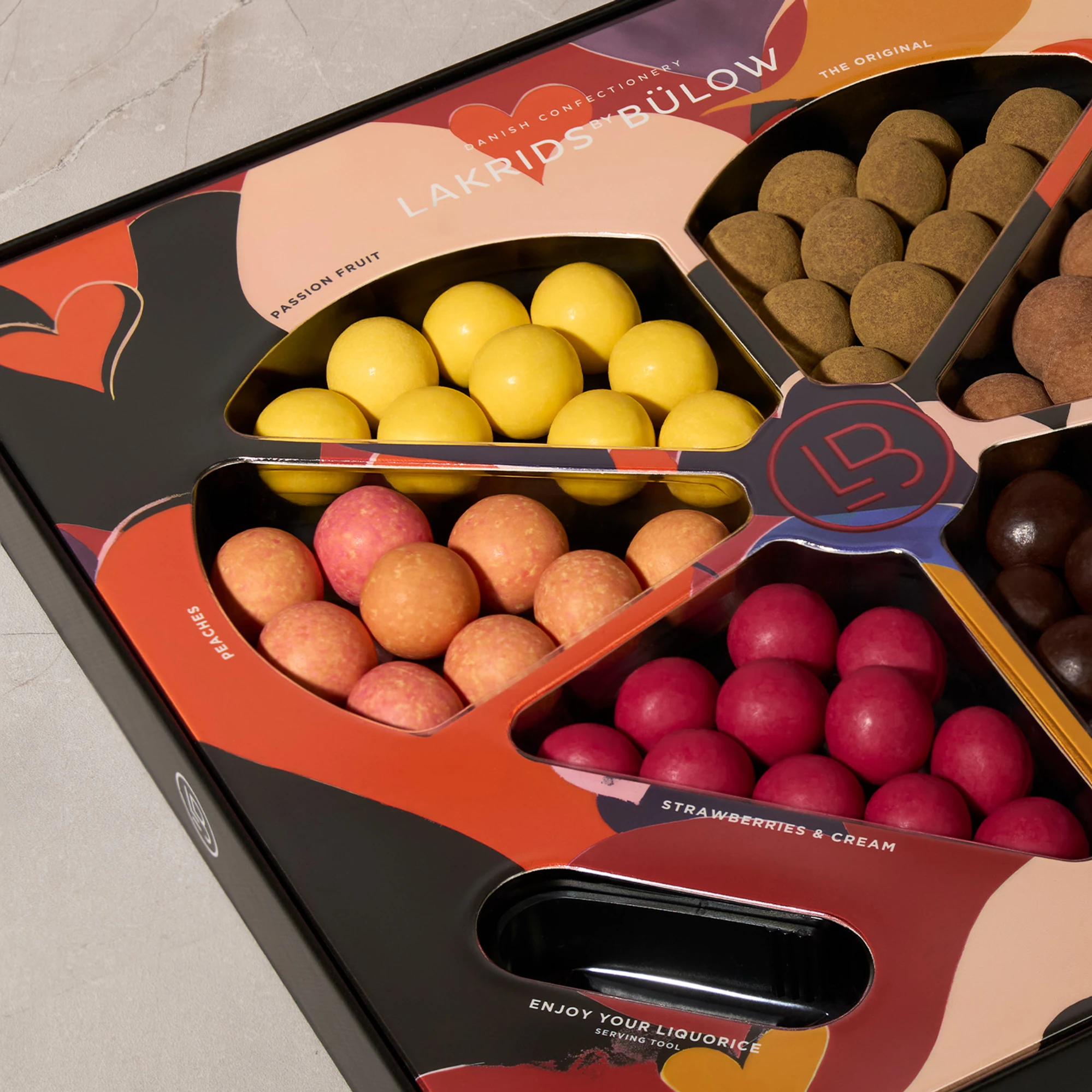 Lakrids by Johan Bülow Love Selection Box, 450g. Juhlista erityisiä hetkiä ylellisellä valikoimalla, joka sisältää kaikkea, mitä sydän voi toivoa. Sydämenmuotoinen LOVE SELECTION BOX -rasiamme tarjoaa sekä klassikkoja että rajoitetun erän makuja: B - PASSION FRUIT, PEACHES, STRAWBERRIES & CREAM, A - THE ORIGINAL, D - SALT & CARAMEL, F - DARK & SEA SALT ja CLASSIC CARAMEL. Täydellinen halutessasi näyttää, että välität. Makea lahja annettavaksi asiakkaille, henkilökunnalle tai kumppaneille.