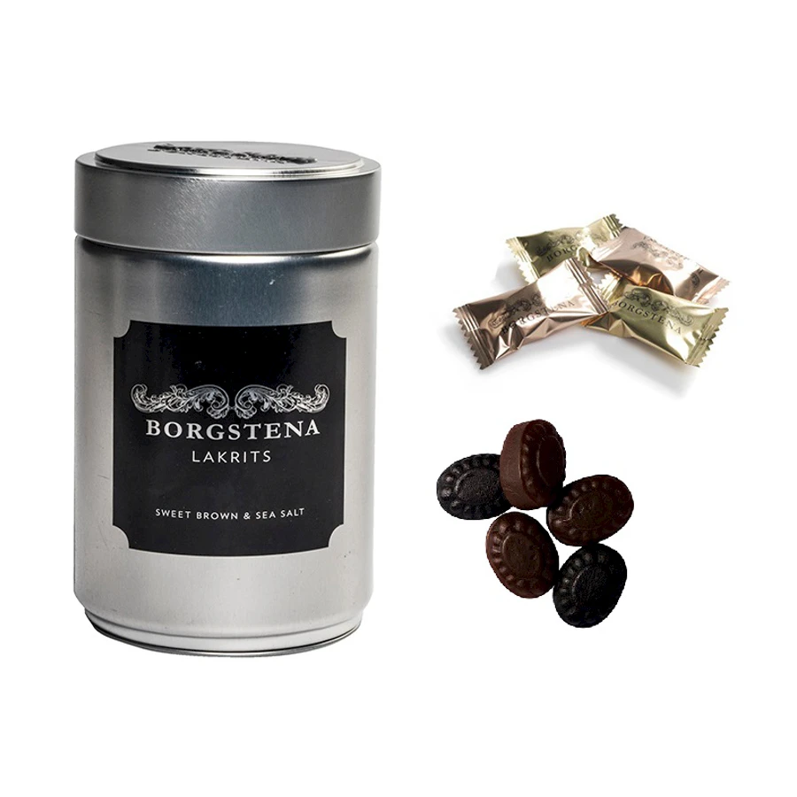 Borgstenan suosittua lakritsia tinaisessa lahjapurkissa. Lakritsipurkin sisällä yksittäin pakattuja suolaisia SeaSalt lakritsipaloja ja makeita Sweet Brown lakritsipaloja. Tyylikäs lahjapaurkki toimii myös säilytyspurkkina. Yrityksesi tervehdys tai logo voidaan painaa erilliseen etikettiin. Pyydä tarjous omasta määrästä ja toteutuksesta.Maku: makea lakritsi/suolainen lakritsi sekoitus.Koko: 250 g