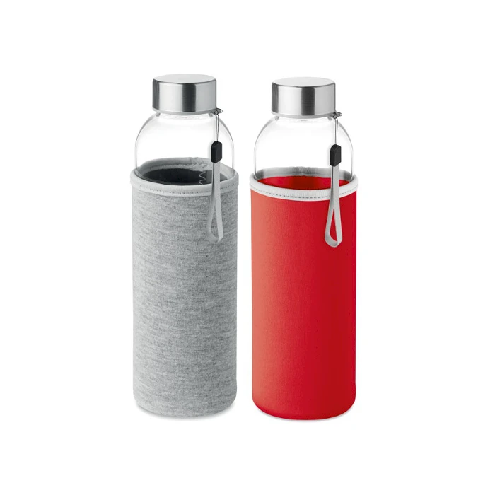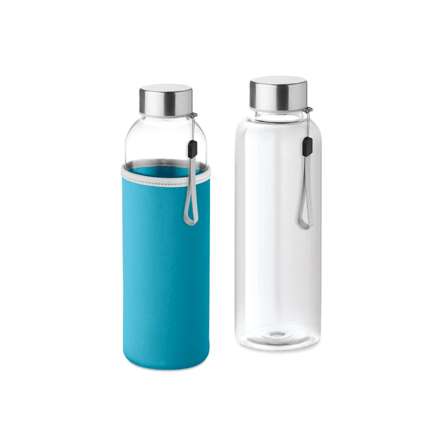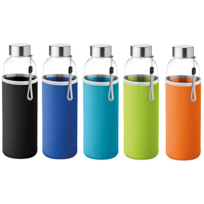 Lasinen Juomapullo 0,5 L pullonsuojuksella. Vesipullossa on pullonsuojus, kierrettävä korkki ja kantolenkki. Lasipullon suojapäälynen on valmistettu neoprene materiaalista, joka eristää tehokkaasti lämpöä ja pitää juoman pidempään virkistävän raikkaana. Lasinen vesipullo on turvallinen elintarvike käyttöön sopiva juomapullo.