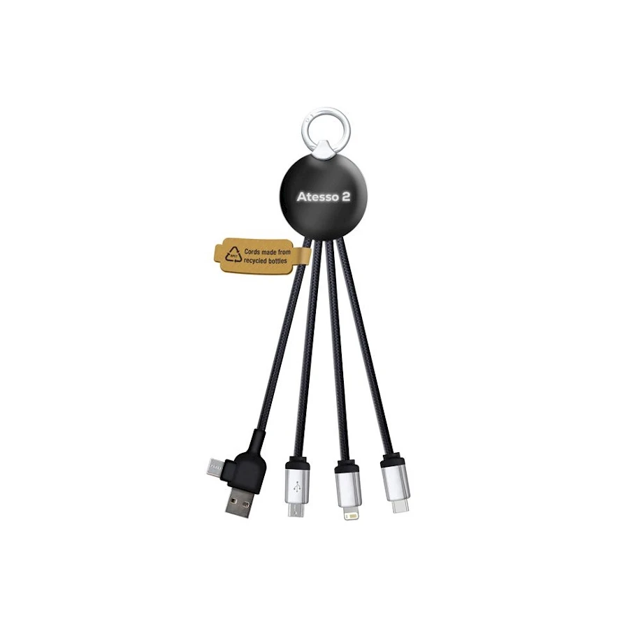 Latauskaapeli Charge RPET 5in1 kierrätysmateriaalista, jossa led-valo valaisee kaiverretun logon. Tämä kattava latauskaapelisarja sopii niin kotiin kuin reissuun. Monen eri laturin sijaan tarvitset vain yhden laturin jolla lataat laitteesi ja tämän latauskaapelisarjan. Latauskaapeli Charge sisältää: USB +Type C, Iphone, USB-A, USB-C, Micro USB, Type C ja Lightning. Saat loistavan valologon piuhojen liittymäkohtaan molemmille puolille. Kaapelit on valmistettu kierrätetystä PET materiaalista rPET. EKO Lahjapakkaus.