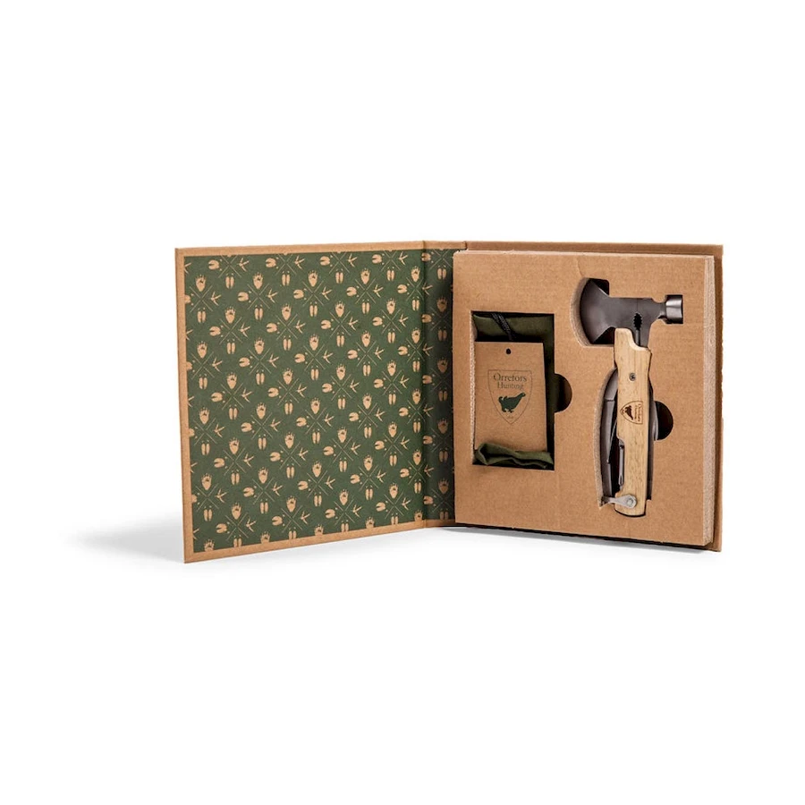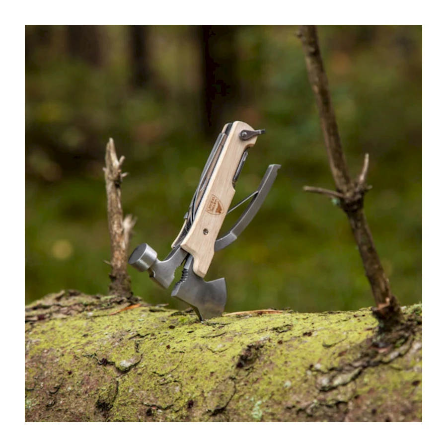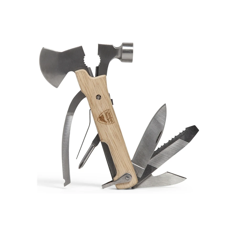 Laadukas monitoimityökalu retkelle tai kotikäyttöön. Teräosa terästä ja kahva kumipuuta. Työkalusta löytyvät pihdit ja leikkurit, vasara, pieni kirves, veitset, kynsiviilat, litteä terä, ristipää sekä tölkinavaaja. Mukana tyylikäs kangaspussi. Työkalu on pakattu lahjapakkaukseen. Pituus: 15 cm.