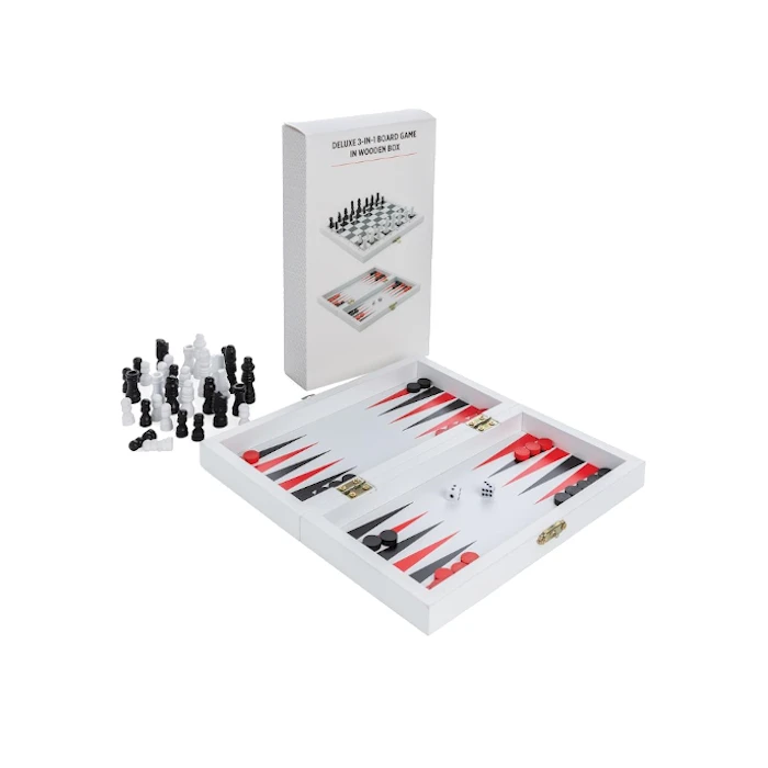 Lautapeli Deluxe 3in1 puulaatikossa. Miksi tyytyä yhteen peliin, kun voit pelata kolmea! Tämä 3-in-1 lautapelisetti sisältää klassisia lautapelejä shakin, checkerin ja backgammonin. Tarjoaa loputtomia tunteja loogista ajattelua. Kaksipuoleisella lautapelisarjalla voit pelata useita eri lautapelejä. Laatikko sisältää 2 noppaa, 30 backgammonpalaa ja kokonaisen shakkisarjan. Toimitetaan värillisessä laatikossa.