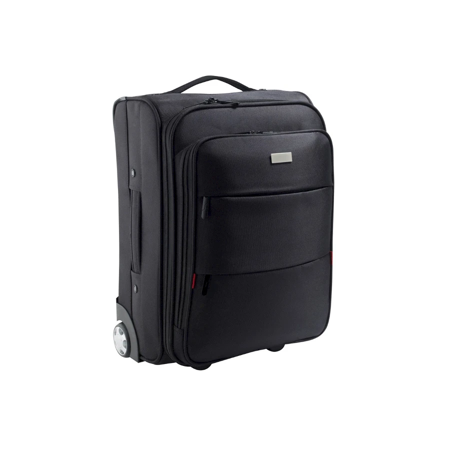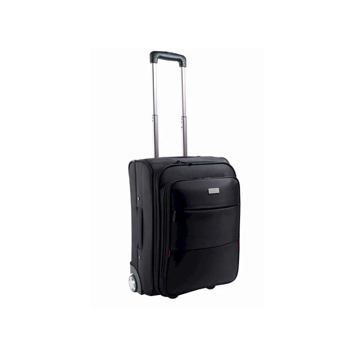 Trolley Airport Lentolaukku on siisti musta matkalaukku jossa kaksi osiota matkatavaroillesi. Laukun sisällä on kaksi leveää kuminauhaa jotka pitävät sisällön tiukasti paikallaan. Isot vetoketjutaskut, monikäyttöisiä sisätaskuja. Teleskooppinen vetokahva helpottaa laukun vetämistä mukana. Verkkotasku kansiläpän sisäpuolella. Hyväksytty useimpien lentoyhtiöiden käsimatkatavarakokoon. Saat yrityksesi logon laukun ulkoreunassa olevaan metallikilpeen. Pyydä tarjous.