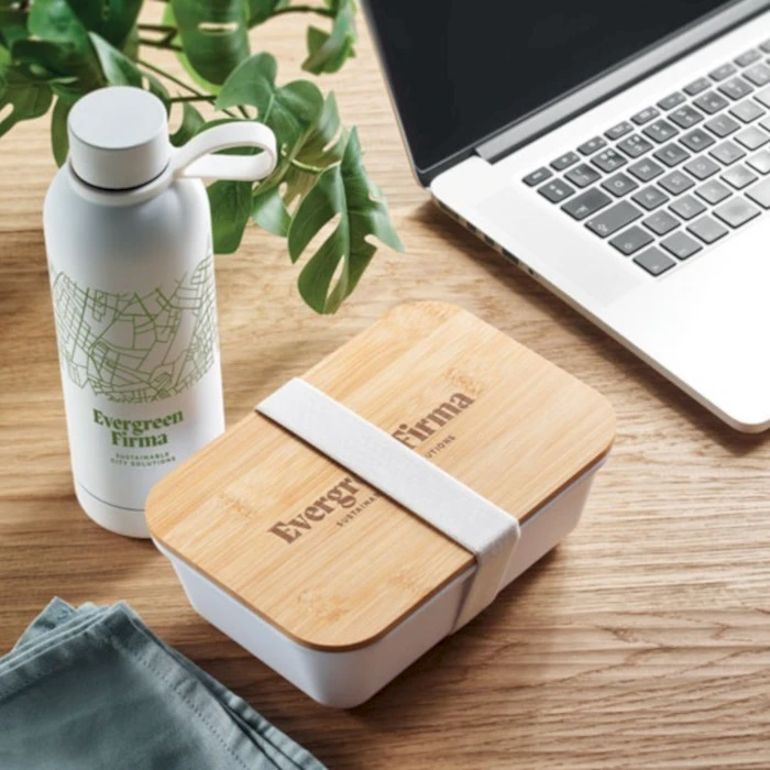Eväsrasia ja juomapullo. 2-osainen lounassetti, jossa kaksiseinäinen tyhjiöeristyspullo kierrätetystä ruostumattomasta teräksestä (90 % kierrätettyä ruostumatonta terästä ja 10 % ruostumatonta terästä) ja lounasrasia PP:stä, jossa bambukansi ja RPET-kuminauha. Vuotamaton. Logomerkkaus mahdollista juomapulloon ja eväsrasiaan.