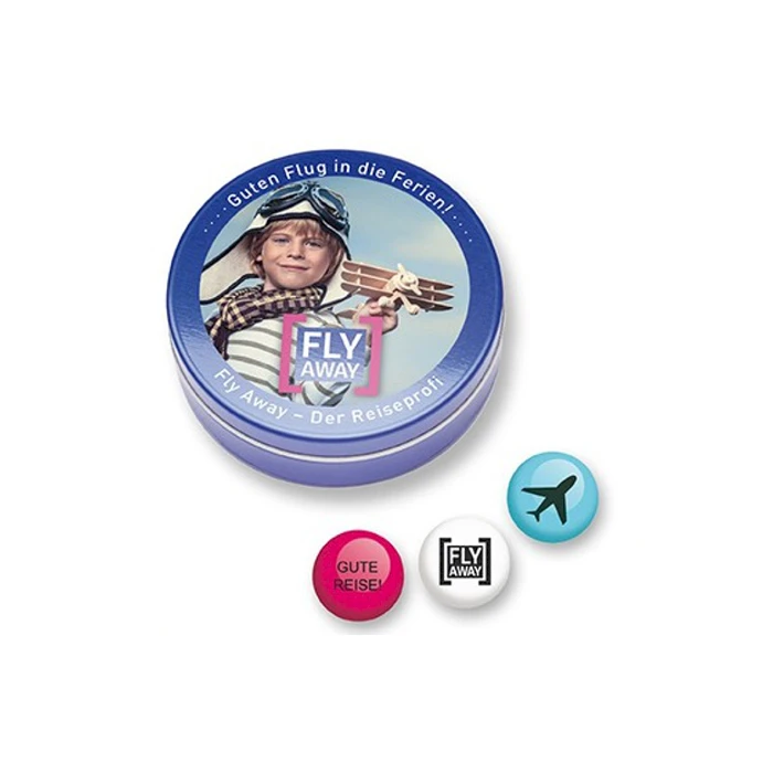 My M&M's® huippusuosittuja maitosuklaarakeita metallirasiassa. Värikkään kuorrutetun suklaalinssimakeisen sisällä on suussa sulavaa herkullista maitosuklaata. Suklaalinssimakeiseen voidaan painaa mustalla yrityksesi logo, kuva tai teksti. Myös rasia on painettavissa monivärisesti. Sekä makeisia että rasiaa on saatavana useissa eri väreissä. Pyydä tarjous omasta toteutuksesta ja määrästä.Koko: Ø 50 x 17 mm, 20 gSäilyvyys: noin 6 kk