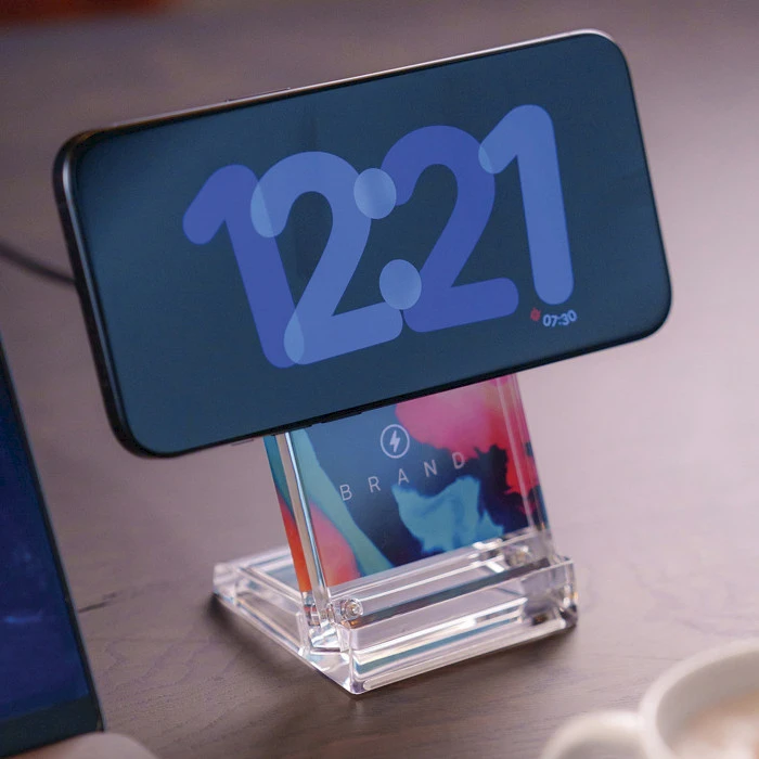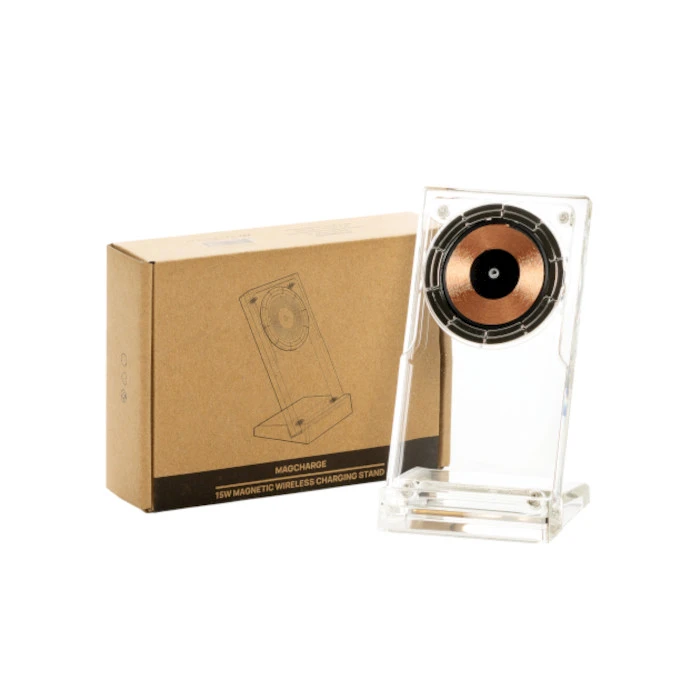 Magcharge 15W magneettinen langaton latausteline. Akryylistä valmistettu langaton latausteline, joka on suunniteltu puhelimille, jotka tukevat magneettista langatonta latausta. Latausteline on varustettu 15W latausteholla. Tuotteessa ylilataussuoja. Voit ladata puhelimesi vaaka- tai pystysuorassa.Telineen mukana tulee 120 cm pitkä USB-C-pikalatauskaapeli. Tuote on pakattu FSC-sertifioituun kraft-pahvilaatikkoon. Saat monivärisen kuvan tai logopainatuksen lataustelineeseen.