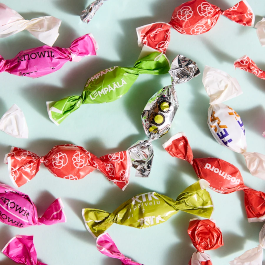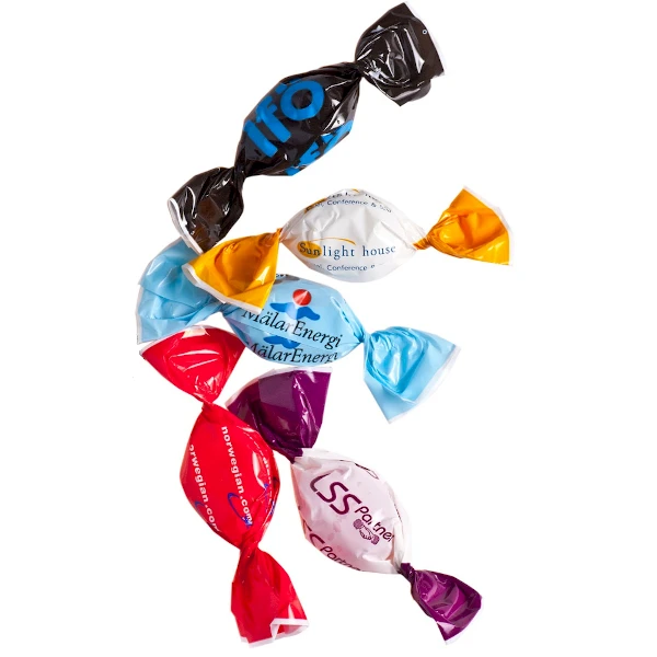 Mainoskaramellit kompostoituvassa kääreessä. Perinteiset makeiset ovat kääritty kompostoituvaan valkoiseen käärepaperiin. Käärepaperit painetaan oletuksena valkoiselle käärepaperille mutta ne voidaan painaa myös hopeanväriselle tai läpinäkyvälle sellofaanille. Perinteinen karamelli on herkullinen viestin välittäjä. Painatukset vesipohjaisilla väreillä.