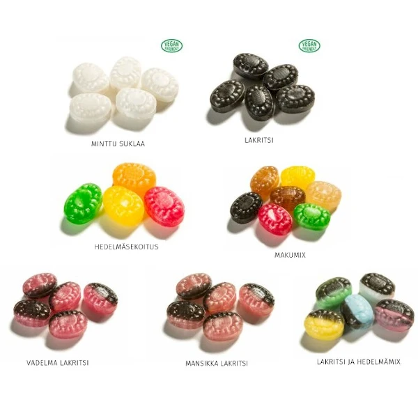 Makeisten makuna: hedelmäsekoitus, minttu suklaatäyte, lakritsi, lakritsi hedelmämix, mansikka lakritsi, vadelma lakritsi, makumix