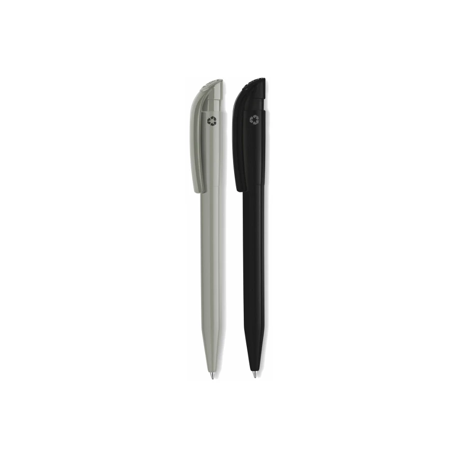 Mainoskynä S45 Recycled. Kynä on valmistettu kierrätysmuovista. Saatavana harmaana tai mustana. Muovi on saatu Euroopasta kerätystä kuluttajajätteestä. Rungon sivussa kierrätysmerkki. Saat kynän runkoon tai klipsiin yrityksesi logopainatuksen. Väri: musta, harmaa Materiaali: 100 % kierrätettyä ABS kuluttajamuovia