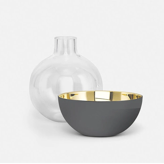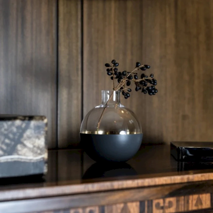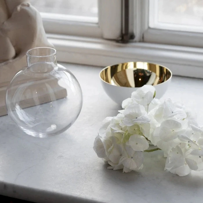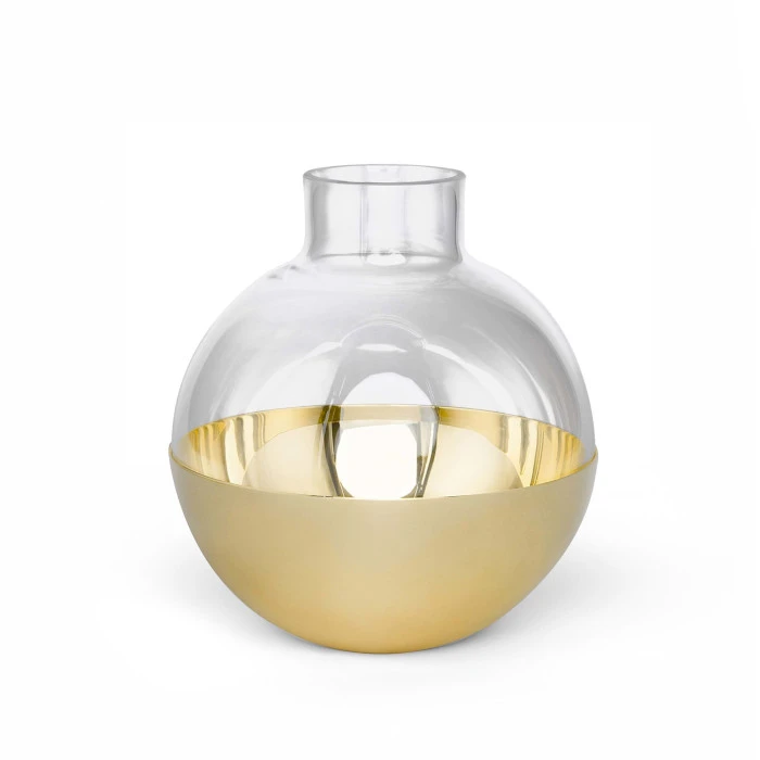 Ihastuttava Pomme maljakko. Pomme on pallomainen maljakko ja kynttilänpidike, joka on valmistettu kirkkaasta lasista ja kiillotetusta messingistä.