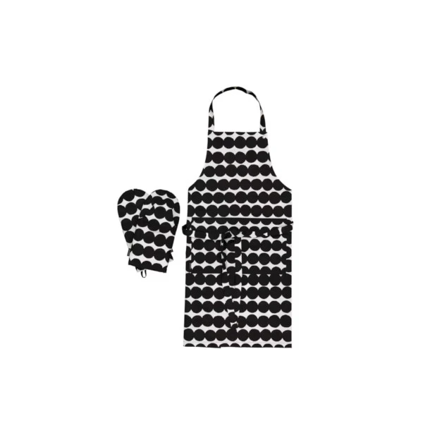 Tähän Räsymatto-keittiötekstiilisettiin kuuluu essu sekä kaksi uunikinnasta. Tekstiilit on valmistettu puuvillasta, joka on painettu Helsingissä. Uunikintaissa on toppaukset ja lenkit ripustamista varten. Essussa on säädettävä kaulanauha ja etutasku. Setti on pakattu Marimekko-logolla varustettuun laatikkoon.