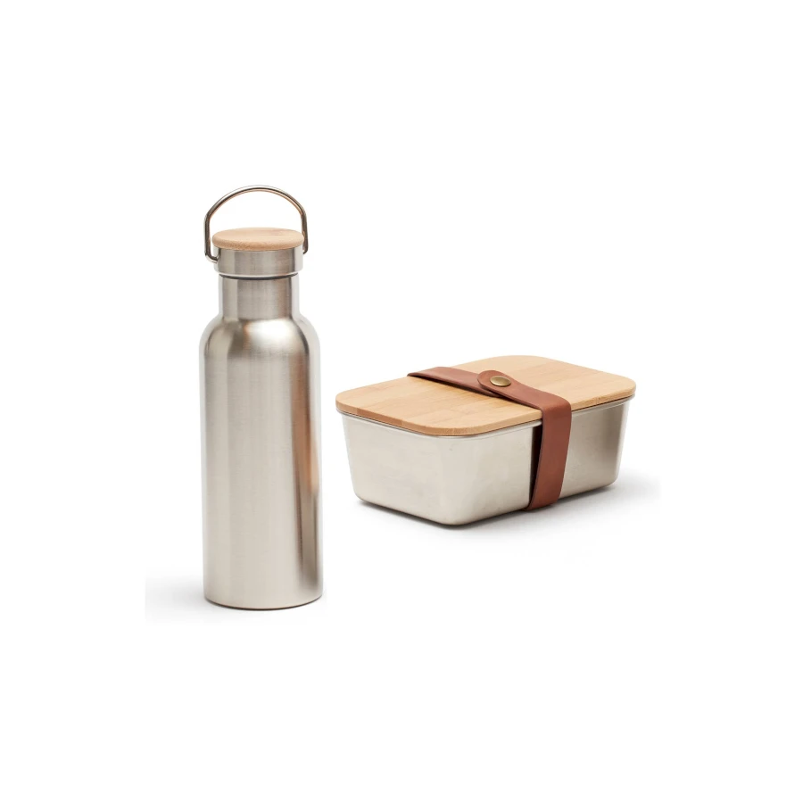Miles -lounasrasia ja termossetti. Miles lounasrasia sopii niille, jotka vievät ruokaa töihin. Rasia toimii myös kotona säilytysastiana jääkaapissa. Metalliastia on hygieninen ja kestävä. Kansi on bambupuuta. Tyylikäs vegaaninahkahihna pitää kannen paikoillaan. Miles termospullossa voit pitää sekä kylmiä että kuumia juomia. Vakuumieristyksen ansiosta juomat säilyvät pullossa kylminä 18 tuntia ja lämpiminä 6 tuntia. Tyhjiön ansiosta kosteutta ei kondensoidu pullon ulkopuolelle, ja lämpö ja viileys pysyvät sisällä. Termospullo on valmistettu 18/8 ruostumattomasta teräksestä, joten nesteisiin ei liukene haitallisia kemikaaleja, makuja tai hajuja.