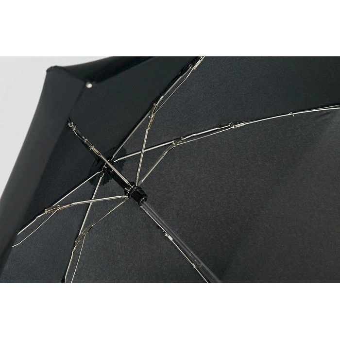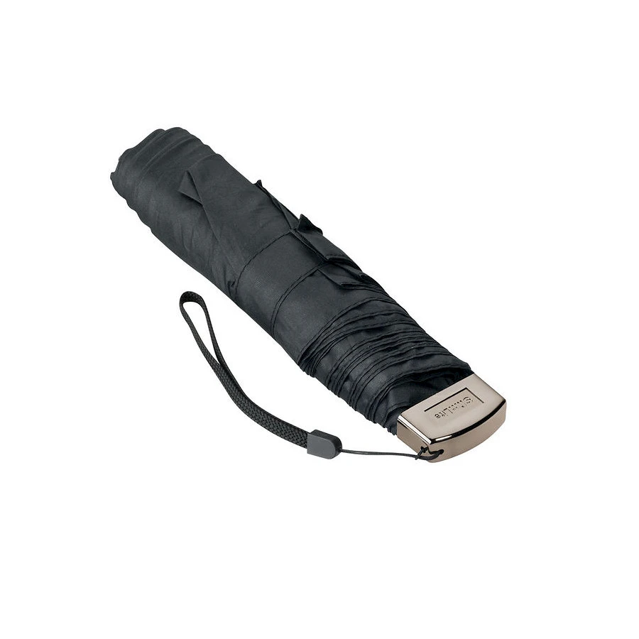 Pienikokoinen Mini sateenvarjo Super Flat on kevyt ja litteä sateenvarjo, joka mahtuu pienenpäänkin laukkuun. Varjossa on myrskymekanismi. Kestävä kolmeosainen kromattu metallivarsi. Viimeistelty tyylikäs tumma kahva. Suojapussi varjon värinen. Väreinä sininen, musta, harmaa. Varjon pituus suljettuna 21,5 cm. Halkaisija 88 cm. Paino vain 160 g. Materiaali 100 % erikoiskevyttä polyesteriä.