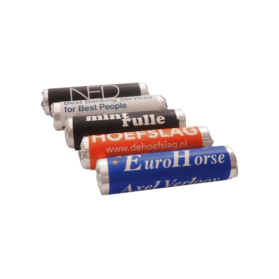 Minttu pastilli rulla omalla mainospainatuksella. Sisällä pyöreitä rypälesokerista ja hedelmäsokerista valmistettuja minttupastilleja. Pastilli on halkasijaltaan noin 20 mm. Rullan pituus noin 70 mm. Minimitilausmäärä 2500 kpl.