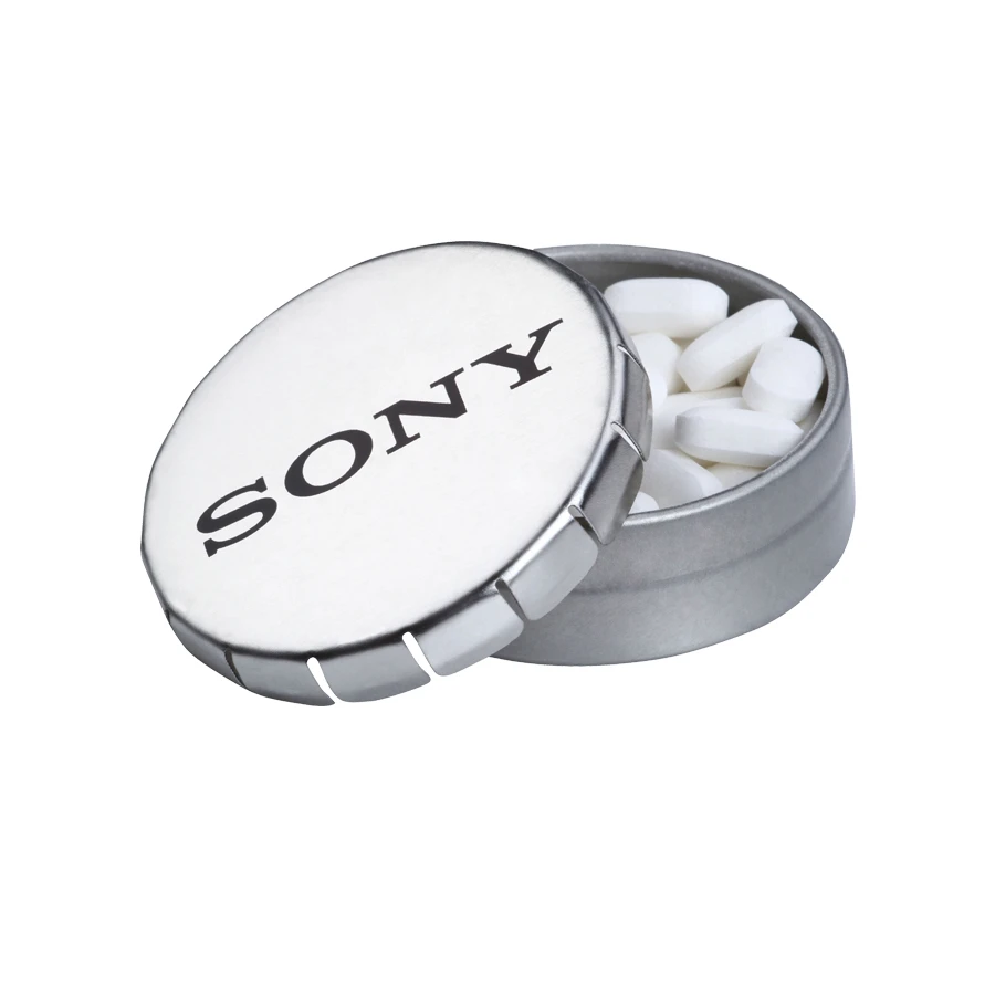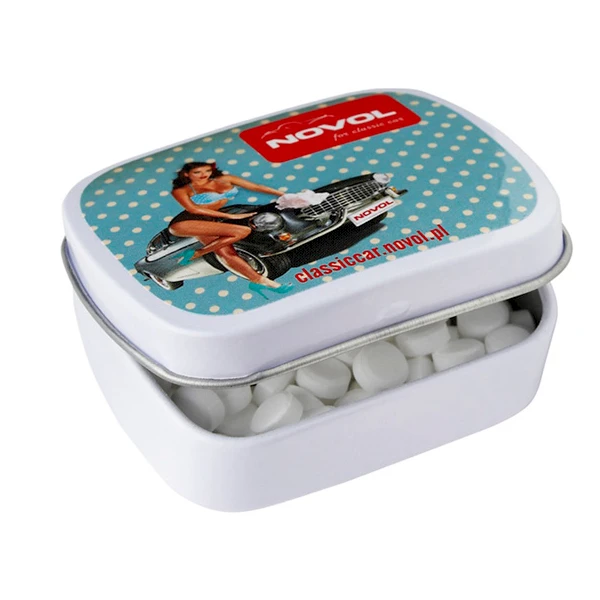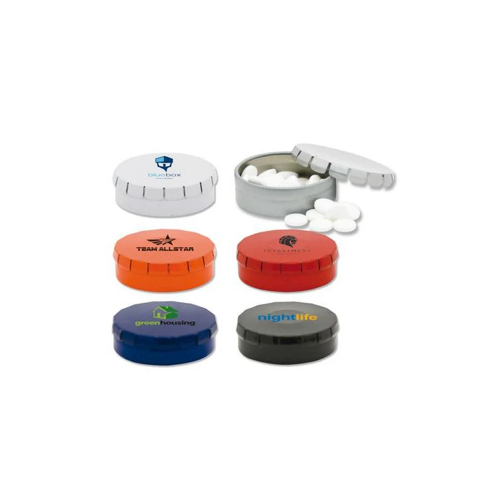 Minttupastillit metallirasiassa omalla mainospainatuksella. Sisällä pyöreitä rypälesokerista ja hedelmäsokerista valmistettuja minttupastilleja. Sisällä 12 g piparminttupastilleja. Minimitilausmäärä 250 kpl.