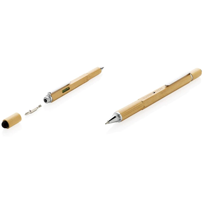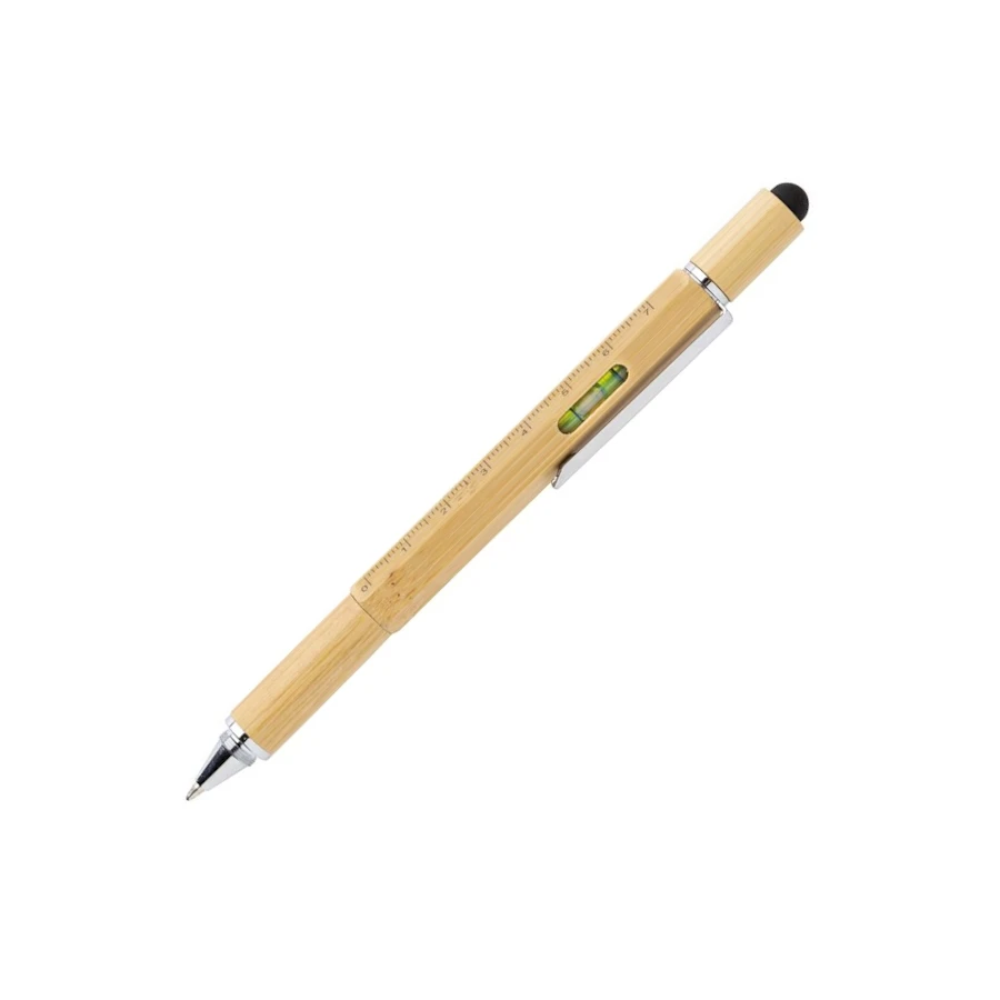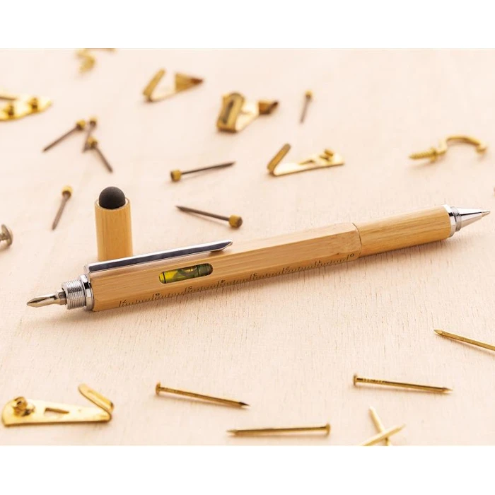 Monitoimikynä 5in1 bambusta. Monitoiminen bambukynä viivaimella (7cm), vatupassi, ruuvimeisseli, ja kuulakärki sinisellä musteella (kirjoituspituus jopa 400m). Valmistettu bambumateriaalista alumiiniklipsillä.