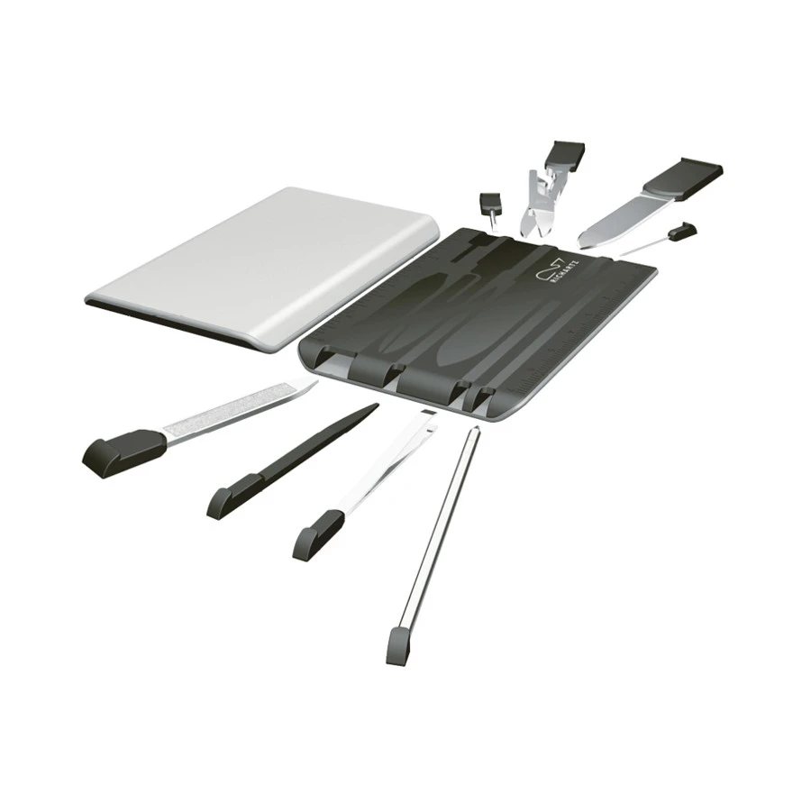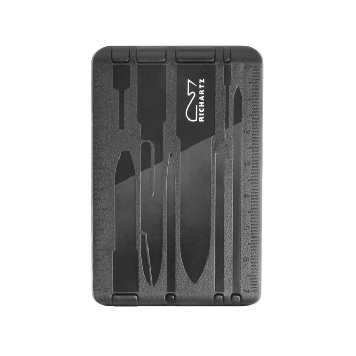 Richartz Card monitoimityökalu on hämmästyttävän monipuolinen, luottokortin mallinen työkalusetti. Laadukkaan korttityökalun sisällä on 8 eri työvälinettä ja toimintoa. Muotoilunsa ansiosta se sopii erinomaisesti laukkuun, lompakkoon tai taskuun - sekä miehille että naisille. Tuotteessa on teräsneula, sakset, kuulakärkikynä, pinsetit, kynsiviila, veitsi, hammastikku, ruuvimeisseli, terä, mitta (cm/tuumat). Pakattu Richartz lahjakoteloon.