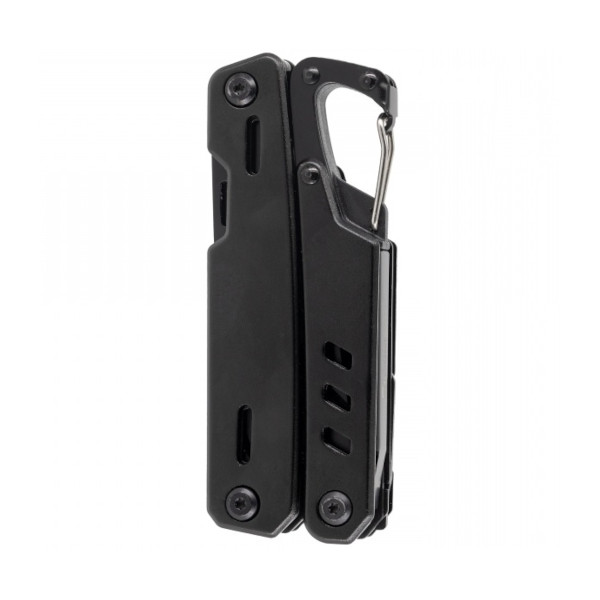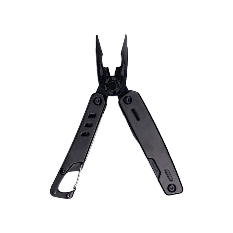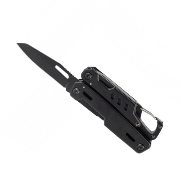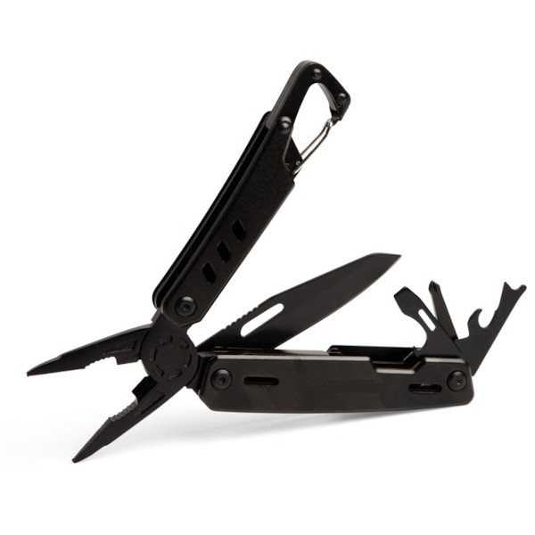 Pieni ruostumattomasta teräksestä valmistettu monitoimityökalu mustalla pinnoitteella. Kompaktissa taskukoon monitoimityökalussa on 11 toimintoa: veitsi, pihdit, saha, ruuvimeisselit, avaajat, viila, kuorintatyökalu ja jakajat – kaikki tarvittavat työkalut kätevässä paketissa. Työkalussa kätevä karabiinikoukku. Toimitetaan neopreenikotelossa. Täydellinen retkeilyyn, arkeen tai lahjaksi. Logomerkkaus mahdollista työkaluun.