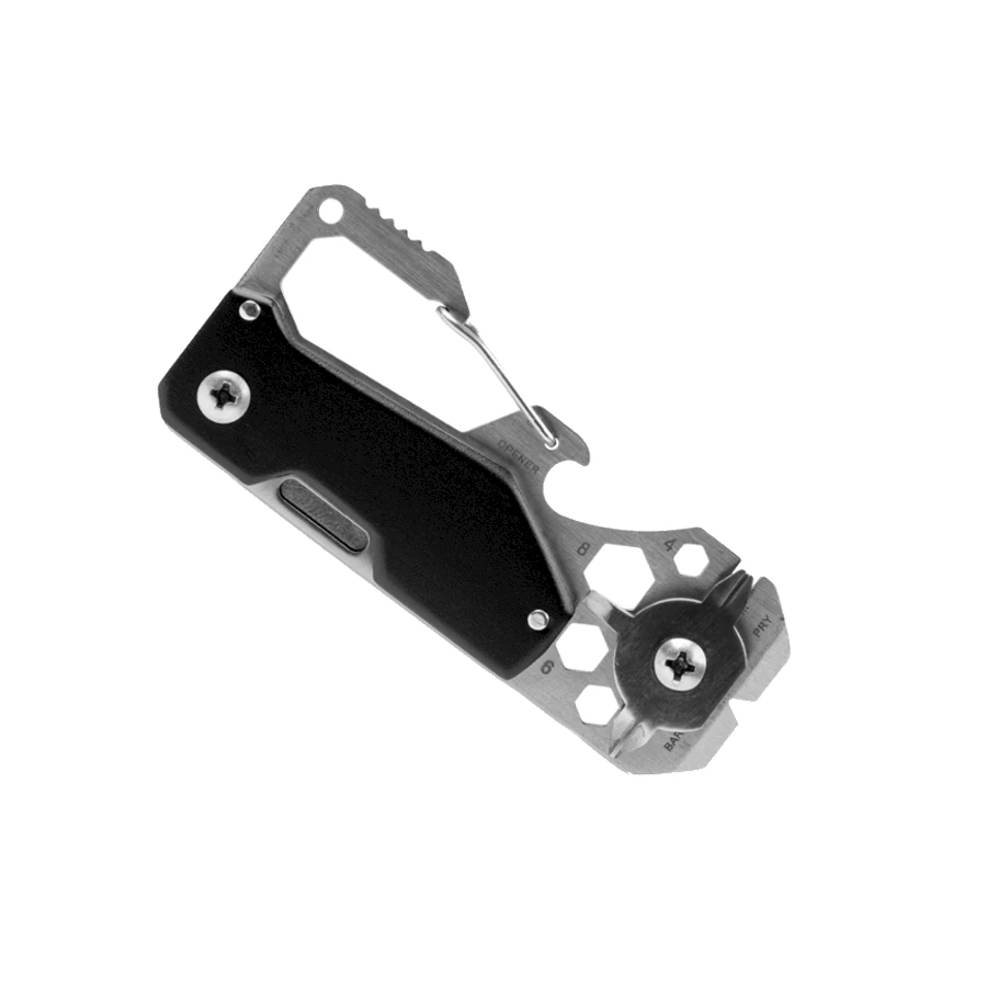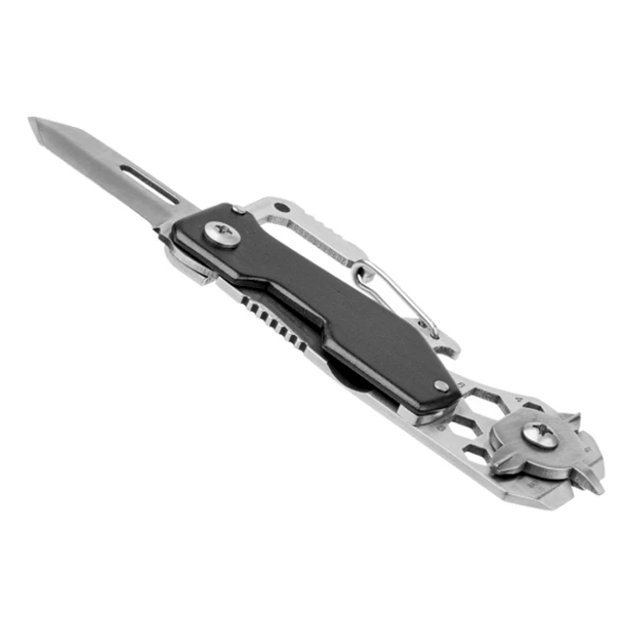 Helposti mukana kuljetettava monitoimityökalu jossa lukittava veitsi, karabiinikoukku, viivain, pullonavaaja, neljä kuusiotyökalua, kiila, 3 ruuvimeisseliä ja sorkkarauta. Koko: 80 x 50 x 5 mm