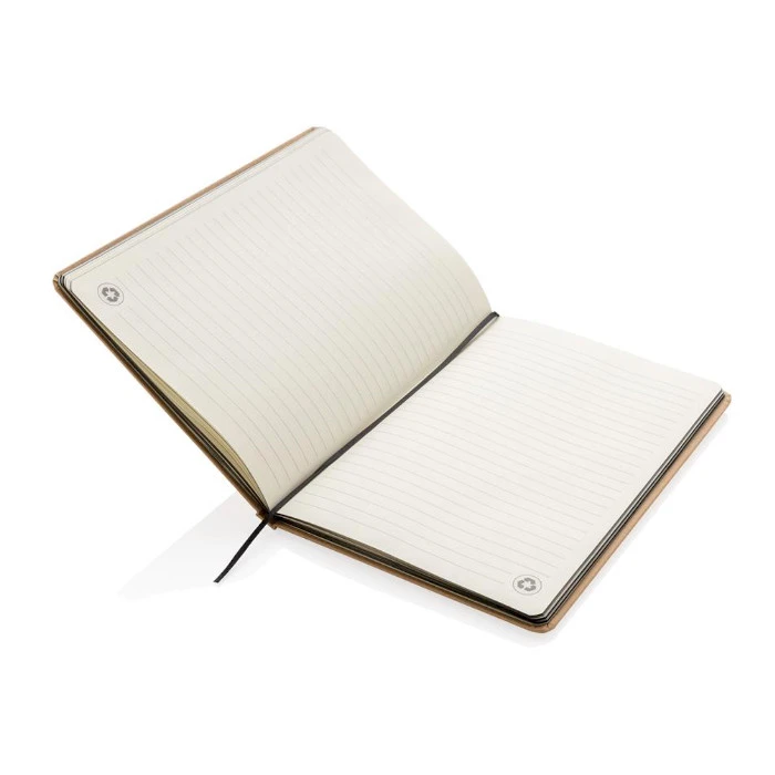 Kierrätetty, käsityövalmisteisella kannella varustettu muistikirja, jossa kierrätetyt paperisivut. 72 aukeamaa / 144 sivua, paino 70 g/m2. Kermanvärinen paperi. Joustava nauha ja kirjamerkki.