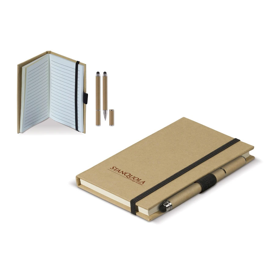 Pahvikantinen A6 muistikirja, jossa kuminauha ja kosketusnäyttökynä. Vihossa 80 kermanväristä viivoitettua sivua 70g/m2. Mukana pahvirunkoinen kosketuskynä joka toimii myös kuulakynänä. Koko 140 x 90 x 14 mm. Logomerkkaus voidaan tehdä muistikirjan kanteen. Muistikirja ja kynä logolla on tyylikäs ja hyödyllinen yrityslahja, joka toimii arjen apuna ja pitää brändisi esillä päivästä toiseen. Setti on erinomainen valinta asiakaslahjaksi, henkilöstön muistamiseen tai tapahtumajakotuotteeksi. Pyydä tarjous omasta määrästä ja logomerkkauksesta.