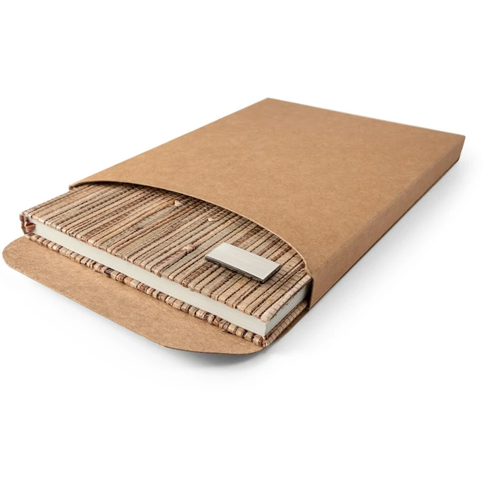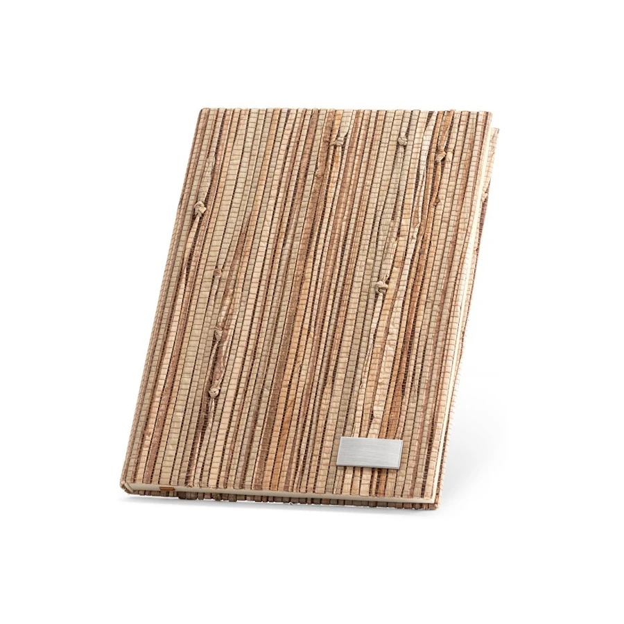 A5 kovakantinen muistikirja olkikuidusta. Sisältää yksilöitävän metallilaatan. Muistikirjassa 192 viivoitettua sivua kestävästi kehitetystä metsätaloudesta. Toimitetaan pahvisessa lahjarasiassa.