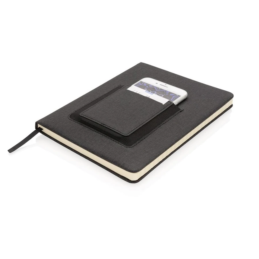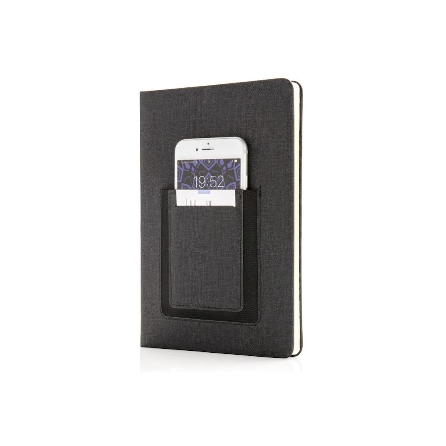 Muistikirja kansitaskulla. Moderni muistikirja jossa joustava etutasku esimerkiksi varavirtalähteelle tai puhelimelle. Muistikirjan koko A5. Kirjassa 160 sivua viivoitettua tilaa muistiinpanoille sekä kirjamerkki sivunjakaja. Paperi 78 g/m². Materiaali PU.