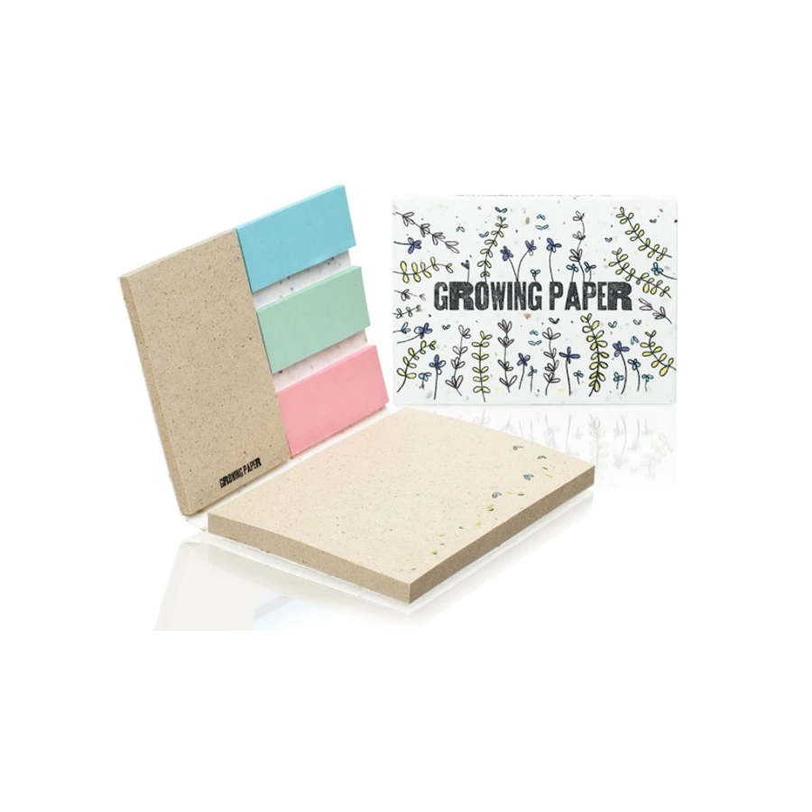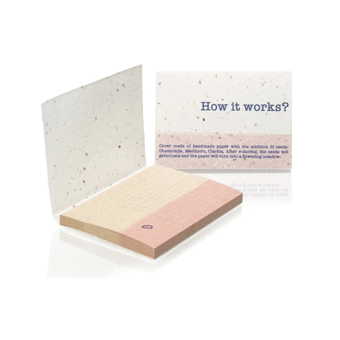 Muistilaput ruohokuidusta ja sertifioidusta puumateriaalista. Ekologisessa paperissa on siemeniä (päivänkakkara, kamomilla, leukoija) jotka alkavat itää kun paperia kastelee. Ruohopaperi on ympäristöystävällinen tuote, jonka valmistaminen säästää vettä ja energiaa verrattuna puukuidusta valmistettuun paperiin.