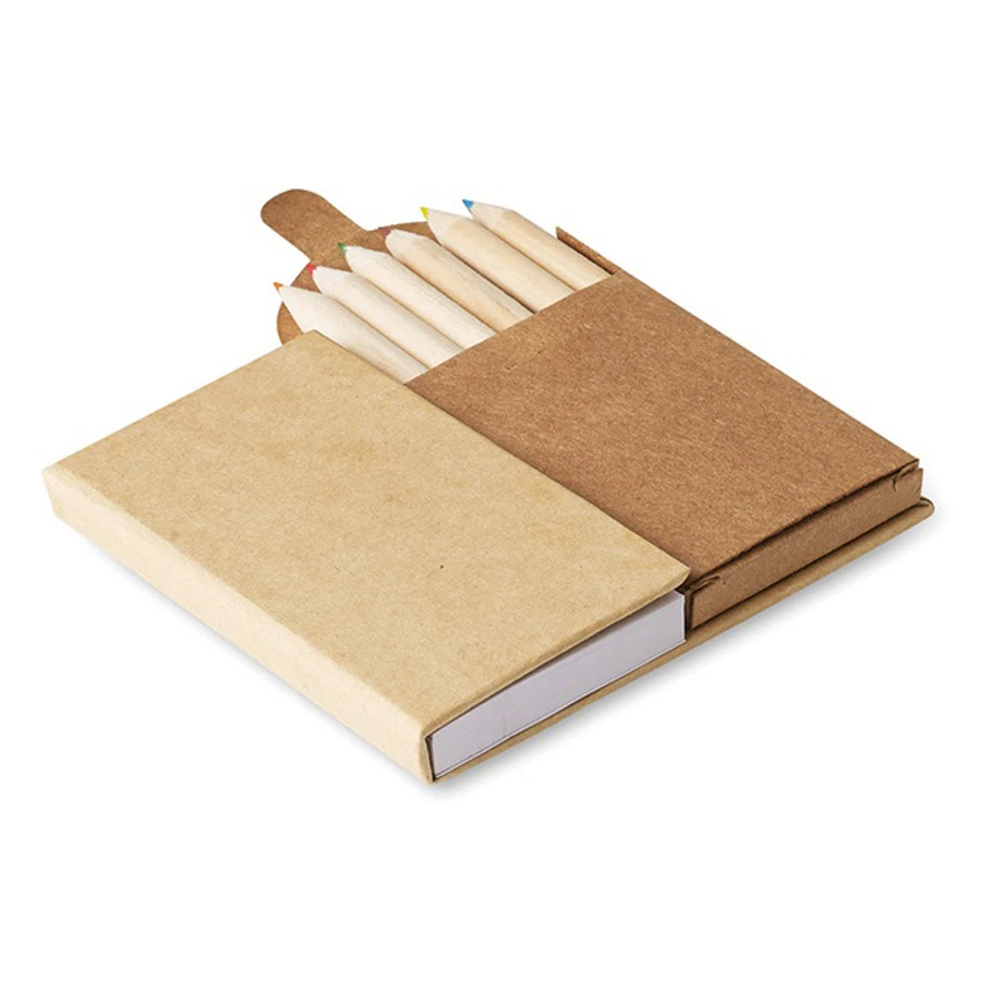 Muistilehtiö ja värikynät pakkaus sisältää kuusi kappaletta puisia värikyniä ja mustilehtiön. Lehtiössä 60 sivua. Koko 10 x 9 x 1,5 cm.