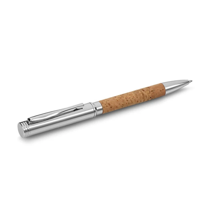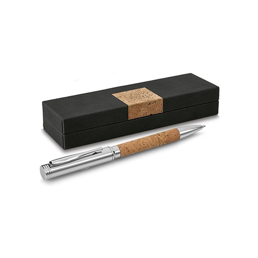 Mustekynä lahjarasiassa. Tyylikkäässä mustekynässä on metalliosat ja korkkia kynän rungon otealueella. Korkki on korkkitammen puunkuorta ja siten 100 % uusiutuvaa luonnon materiaalia. Pakattu lahjakoteloon.