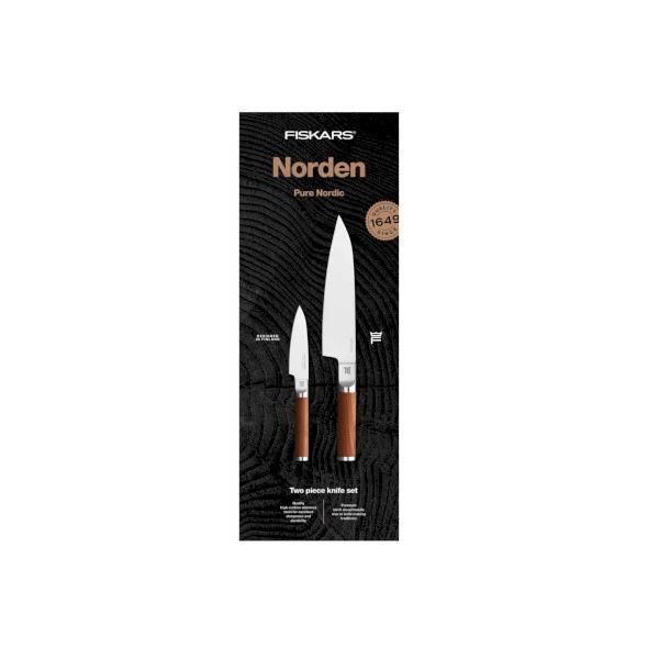 Fiskars Norden -sarja ammentaa inspiraationsa ajattomasta pohjoismaisesta muotoilusta ja luonnosta. Korkealuokkaiset Norden-veitset on valmistettu veitsentekoperinteitä kunnioittaen. Tähän kahden veitsen settiin kuuluu iso kokkiveitsi ja vihannesveitsi. Norden-kokkiveitsellä paloittelet hetkessä niin lihan kuin kasviksetkin. Norden-vihannesveitsi taas on täydellinen pikkutarkkaan työskentelyyn, kuten hedelmien ja kasvisten kuorimiseen ja paloitteluun. Ruostumattomasta saksalaisesta laatuteräksestä valmistettu terä takaa ensiluokkaisen käyttökokemuksen ja pysyy terävänä pitkään. Norden -keittiöveisten kahva on valmistettu laadukkaasta pohjoismaisesta koivusta, mikä lisää tuotteiden luontaista kauneutta. Puulajit ovat luontaisesti hygieenisiä ja helppohoitoisia. Suositellaan pestäväksi käsin. Suunniteltu Suomessa.