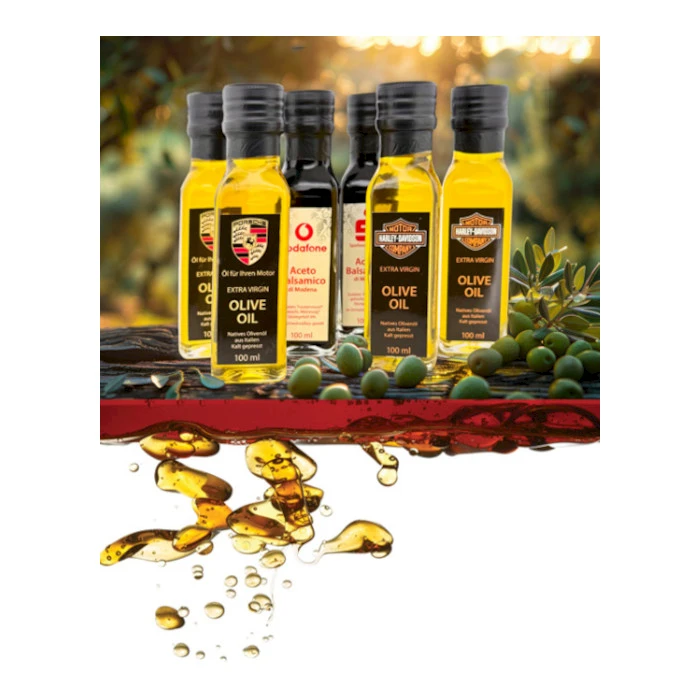 Oliiviöljypullo omalla logolla on tyylikäs ja arvostettu lahja. Anna lahjaksi ensiluokkaista Bio-oliiviöljyä Etelä-Italian Pomaricosta tyylikkäässä 100 ml pullossa, jossa on yrityksesi logo tai oma tervehdyksesi. Luomuviljellyt BIO oliivit kylmäpuristetaan kivimyllyssä ilman suodatusta, mikä säilyttää öljyn aidon maun ja aromin. Laadukas ja perinteisesti valmistettu Bio oliiviöljy yhdistää hyvän maun ja tehokkaan brändinäkyvyyden. Pullossa 100 ml oliiviöljyä.