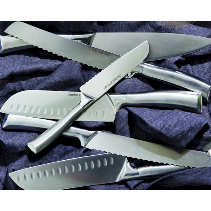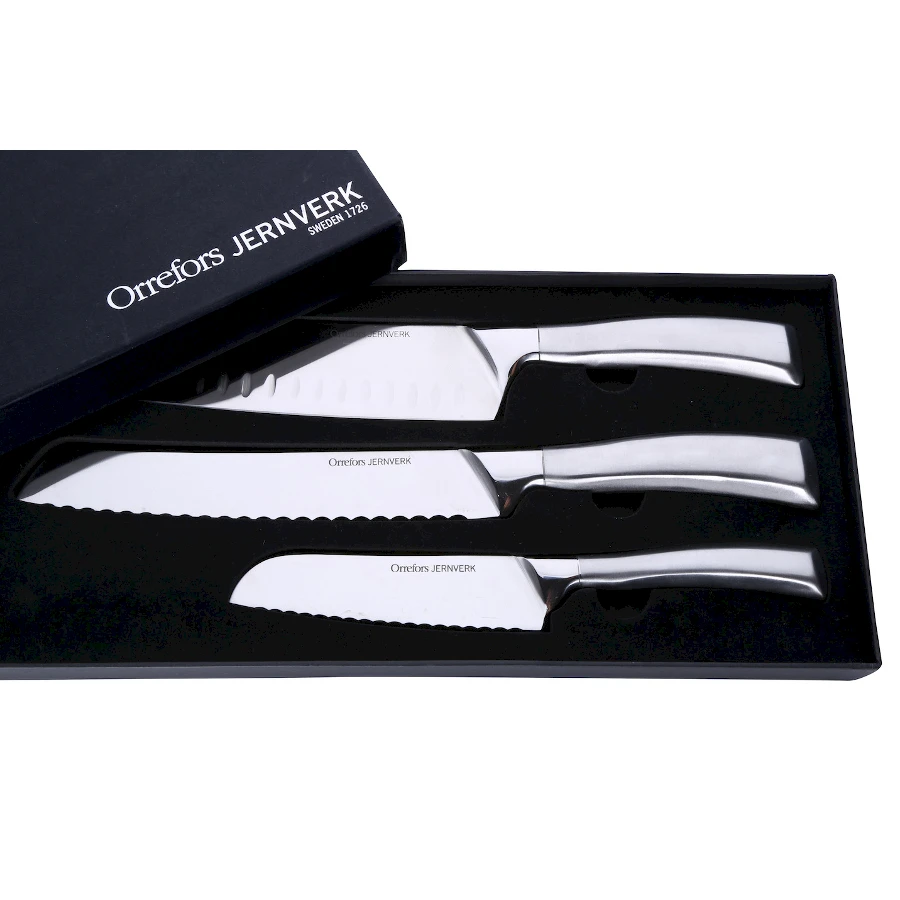 Orrefors Jernverk japanilaistyyliset keittiöveitset 3 kpl/pakk. Käytännöllinen ja laadukas veitsisetti joka soveltuu kaikenlaiseen leikkaamiseen ja fileointiin. Terävät veitset sopii erityisen hyvin raa'an kalan, hedelmien, sienten ja leivän leikkaamiseen. Orrefors Järnverkin veitset on valmistettu laadukkaasta saksalaisesta teräksestä. Setissä Japanilainen kokkiveitsi 17,5 cm, leipäveitsi 20 cm ja tomaattiveitsi 12,5 cm. Lahjalaatikko. Logomerkkuasta suosittelemme kaivertamalla.