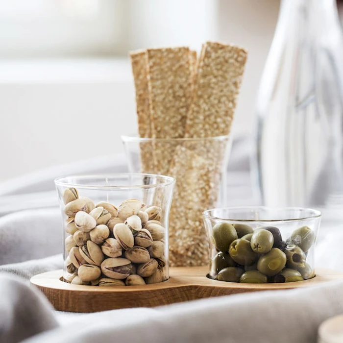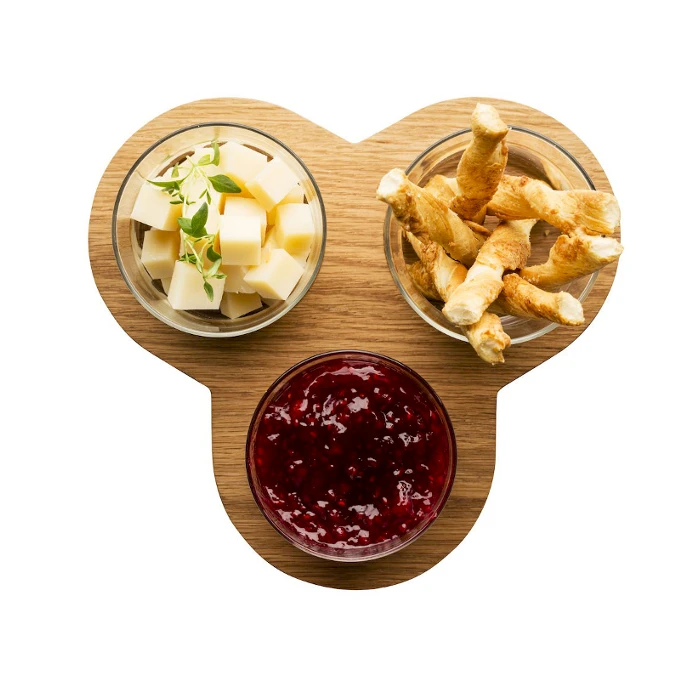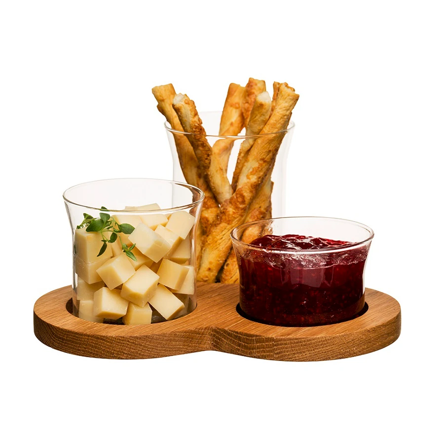 Käytännöllinen tarjoilusetti naposteltaville tai tapaksille. Erikokoiset lasikulhot tuovat tarjottavat kauniisti esiin ja viimeistelevät kattauksen tyylikkäästi. Tarjotin on tehty korkealaatuisesta massiivitammesta. Muista öljytä tuote säännöllisesti. Koko: 210 x 224 mm x H115 mmLahjapakkaus.